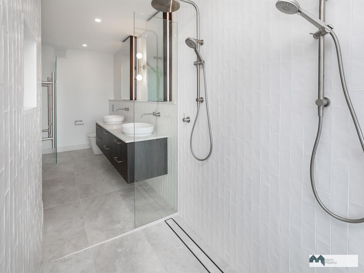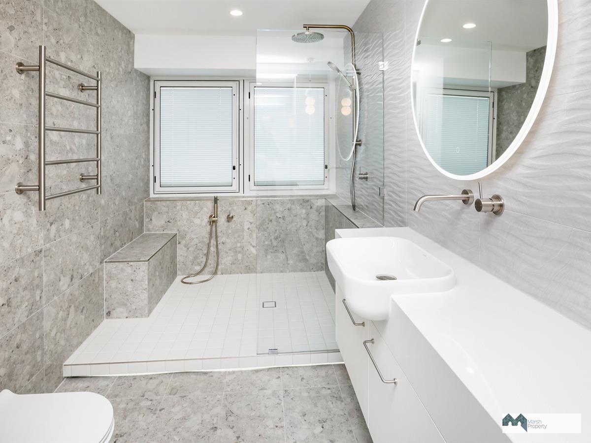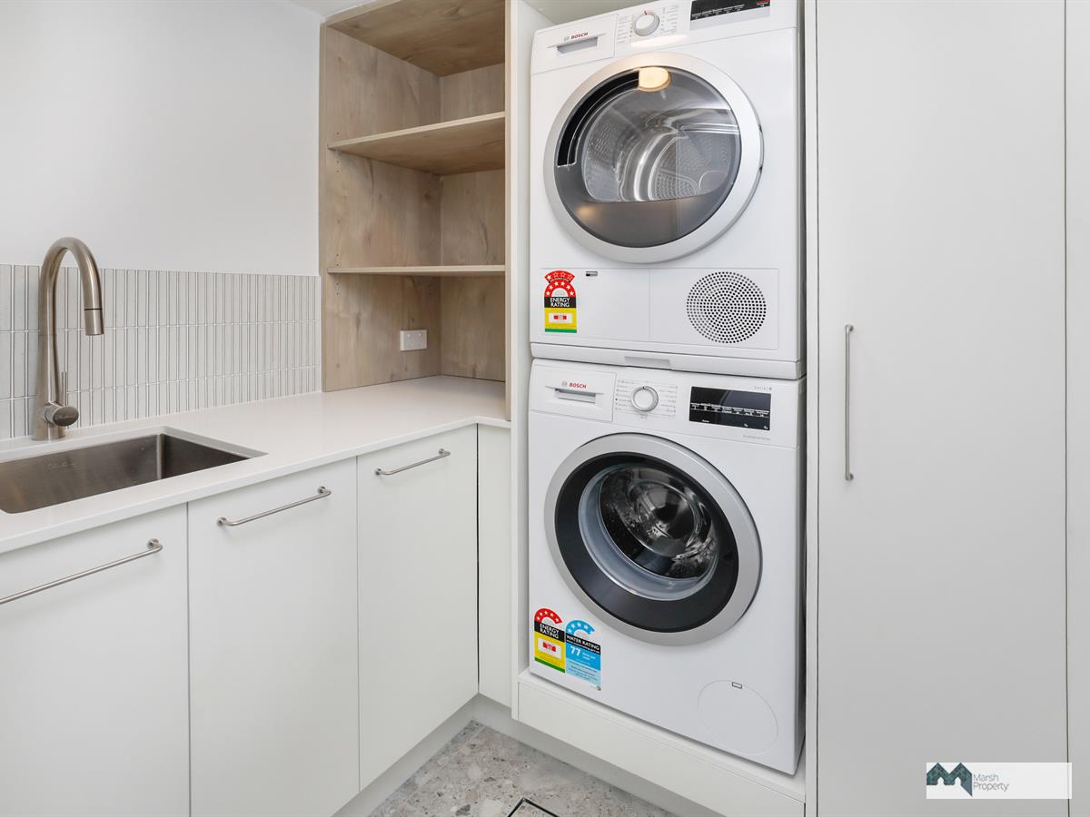 The quality fittings you will find include: a well-appointed kitchen with Bosch wall oven & microwave, induction down-draught cook top and Bosch dish washer. The fully integrated F & P Euro door fridge and freezer is almost invisible, the cabinetry is soft close with creative pantry storage plus Zip hot / cold tap. The laundry is discreetly located adjacent the second bathroom and includes Bosch stacked washing machine and dryer. Lighting is very on trend and subtle with loads of glass providing natural lighting as required.