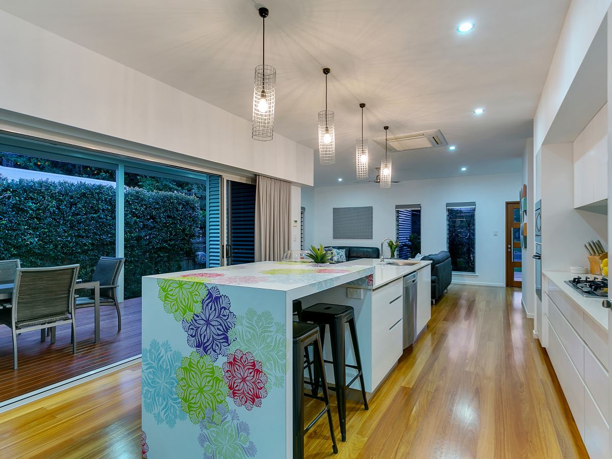 The inviting open plan layout has natural zones for lounging, dining and relaxed family time. The light filled living, flows seamlessly through to the meals area and central sleek kitchen, boasting an opulent Caesar stone bench tops with a feature breakfast bar, quality stainless steel appliances and high gloss cabinetry.