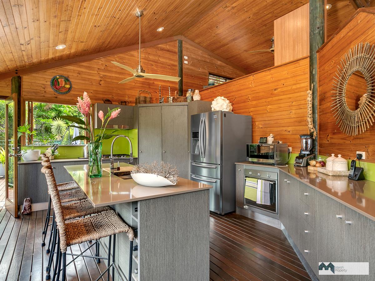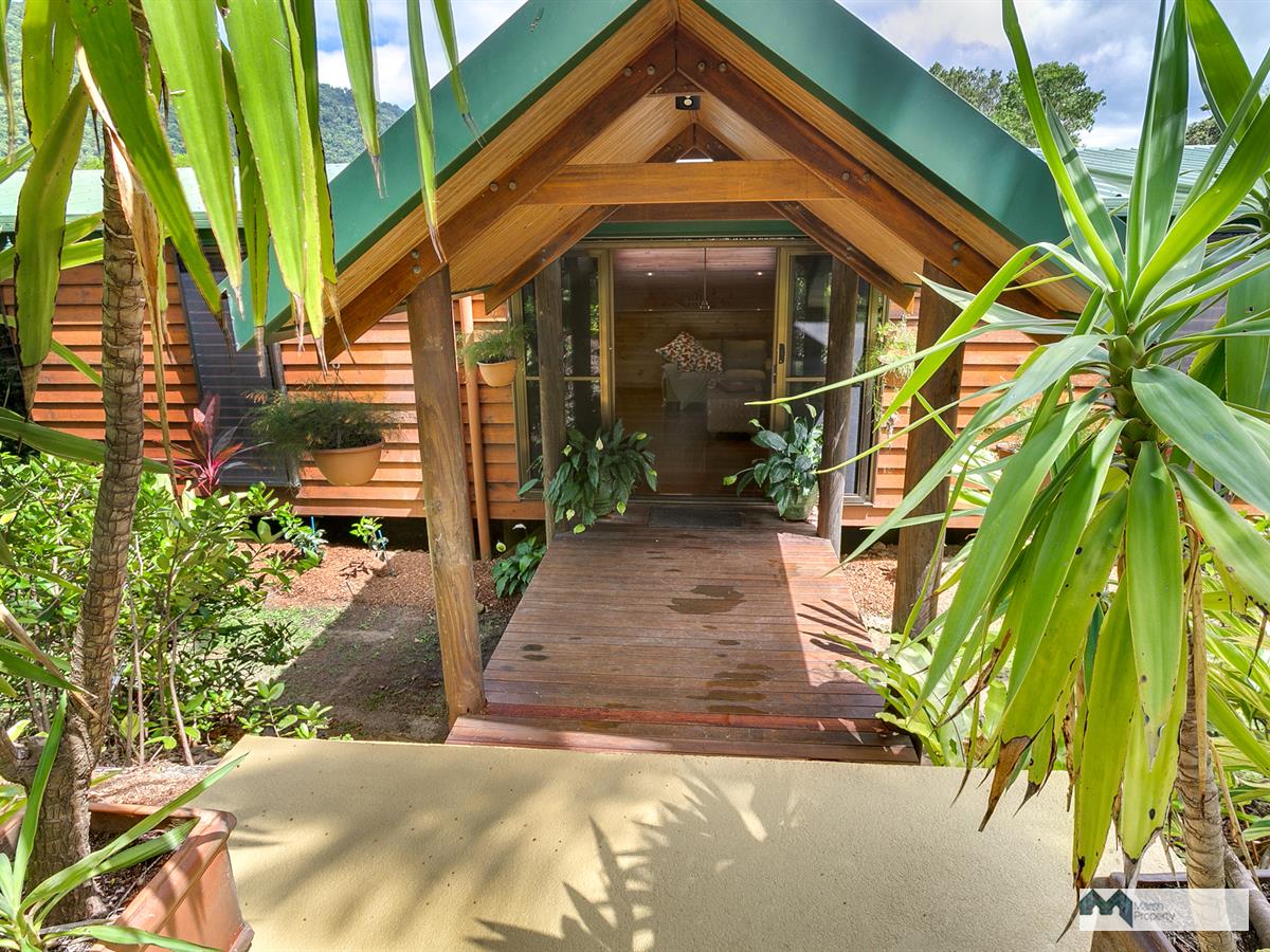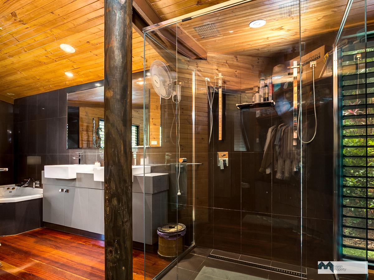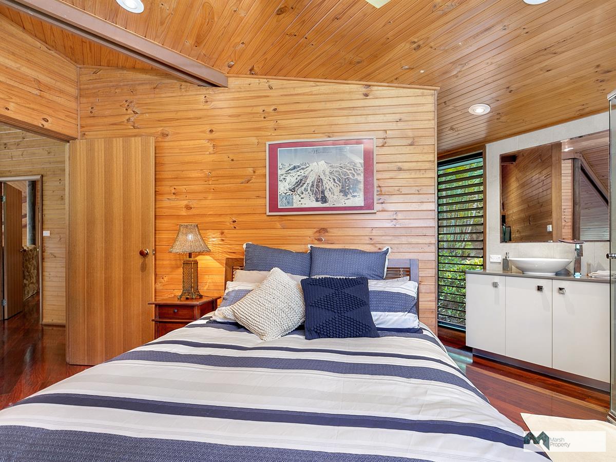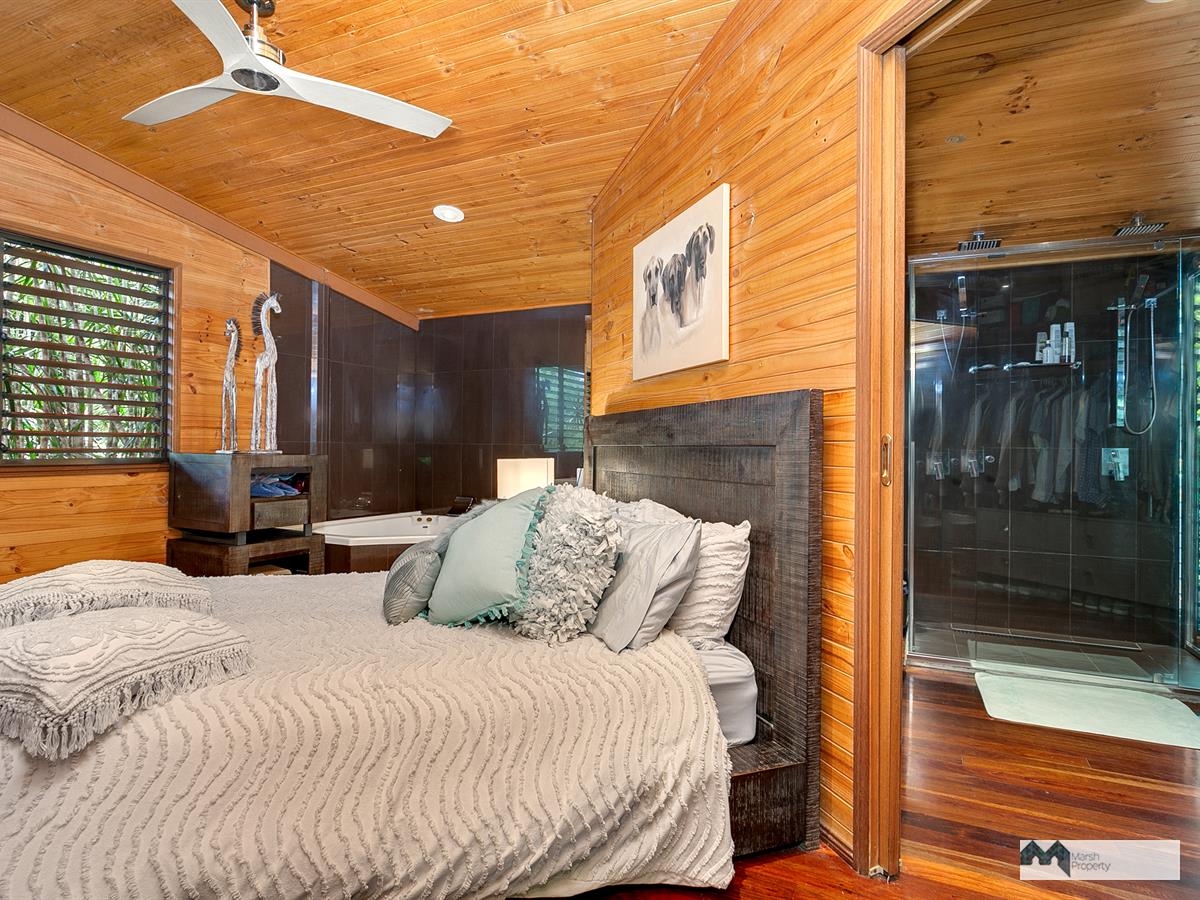 Venture up the driveway and explore this property's high ceilings and open plan, breezeway design. Three large open-air bedrooms are located on the mezzanine and one extra bedroom (or guest quarters/home office) is detached from the main house, located on the upper level of the grounds. Each of the three bedrooms in the main house also has its own ensuite and walk in robe and opens on to the air conditioned central living space.