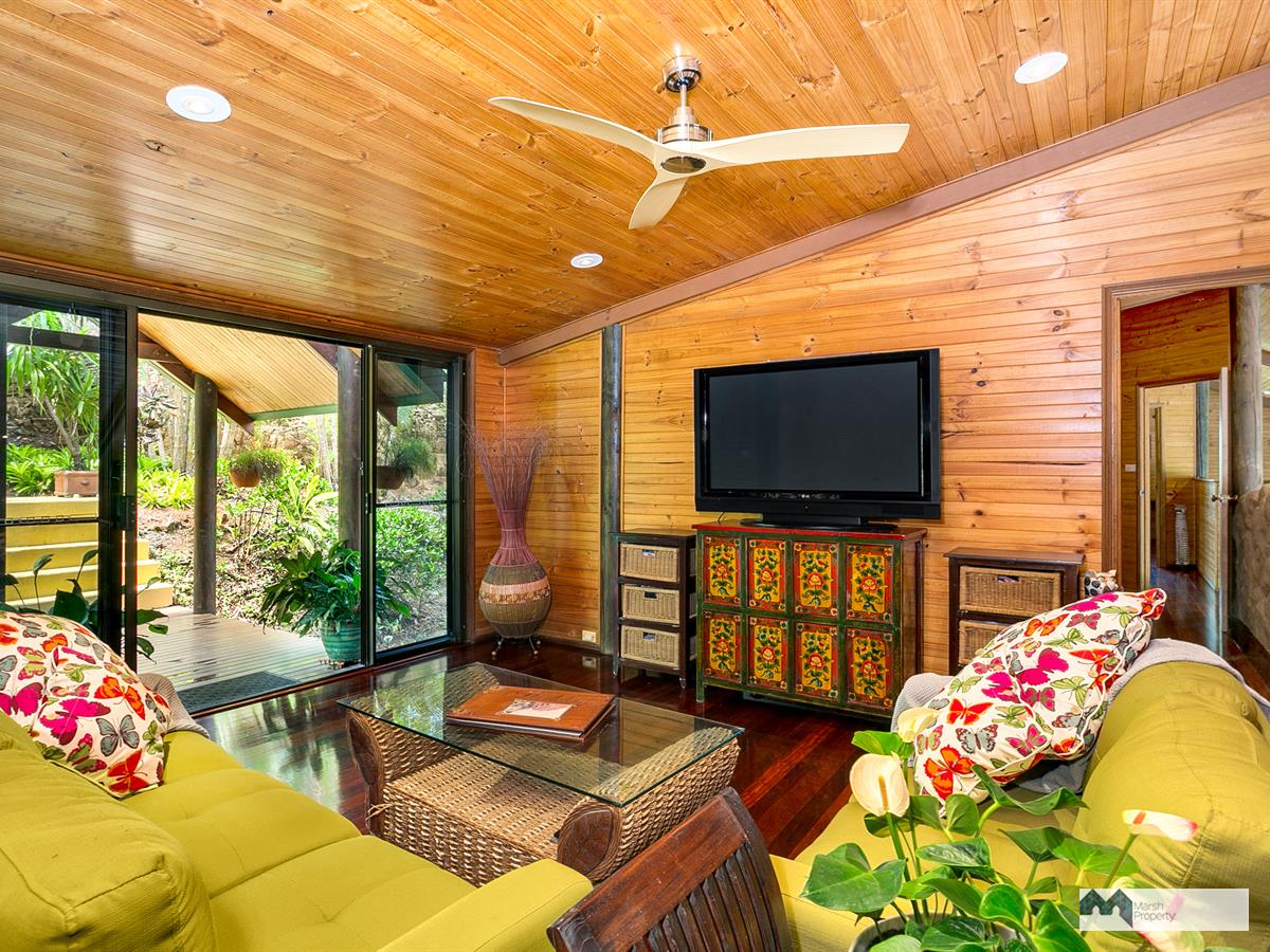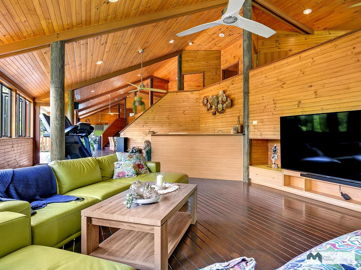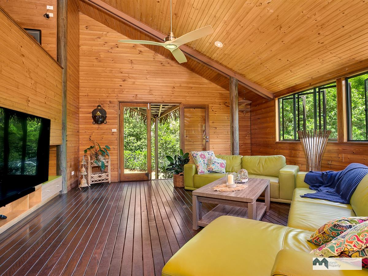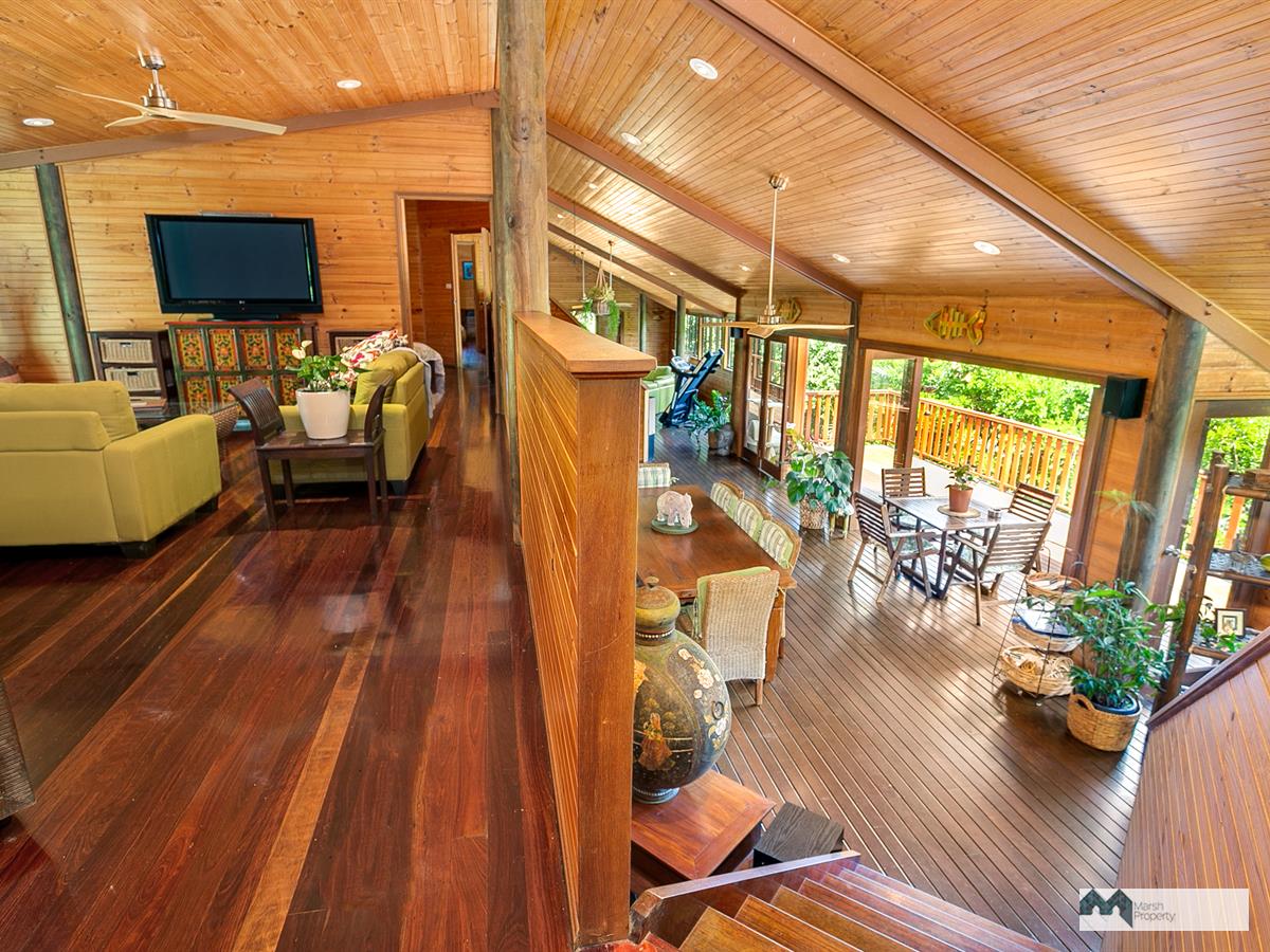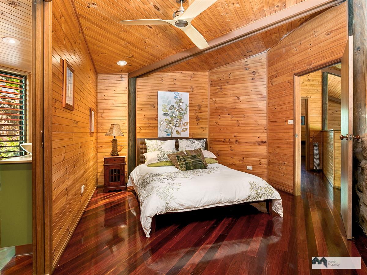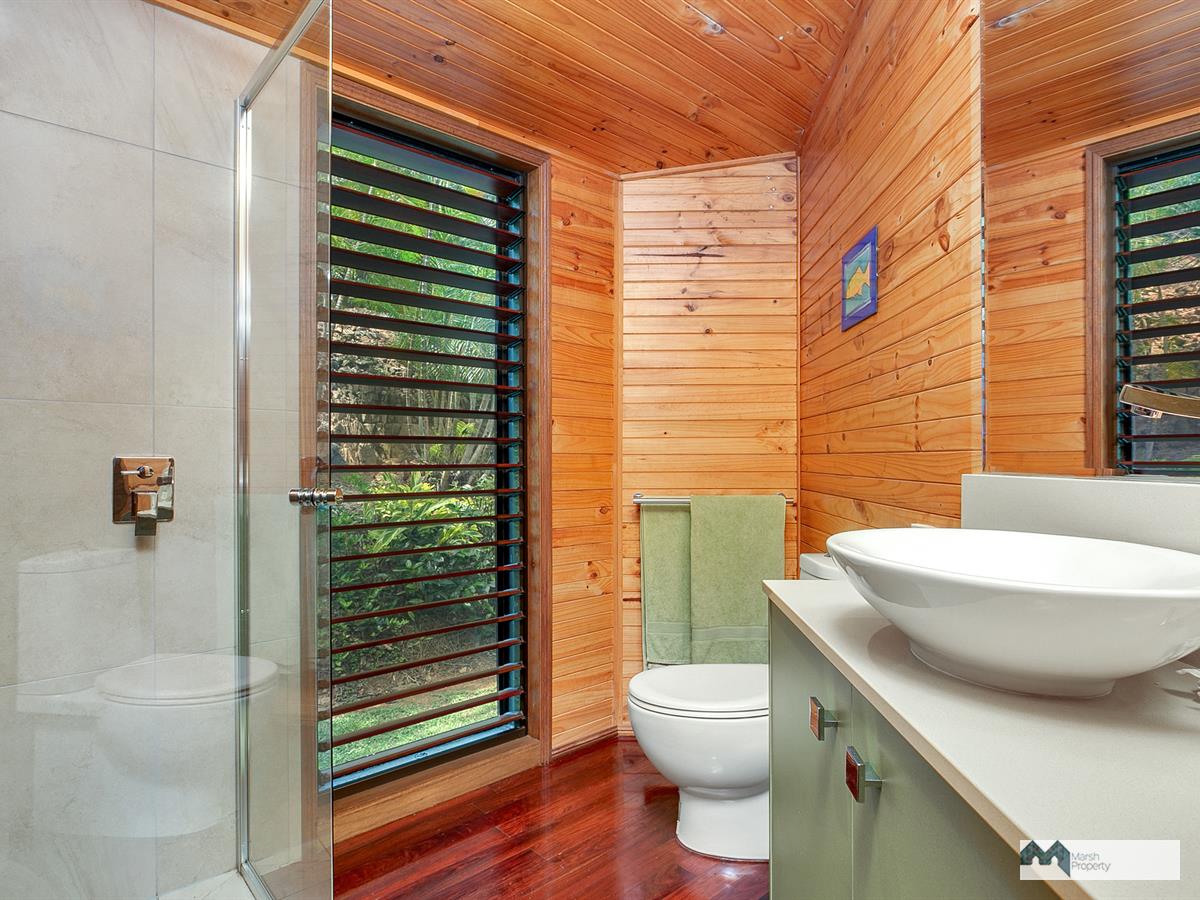 Venture up the driveway and explore this property's high ceilings and open plan, breezeway design. Three large open-air bedrooms are located on the mezzanine and one extra bedroom (or guest quarters/home office) is detached from the main house, located on the upper level of the grounds. Each of the three bedrooms in the main house also has its own ensuite and walk in robe and opens on to the air conditioned central living space.