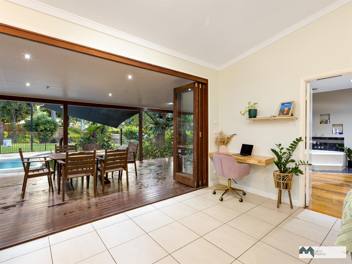 The central living area opens onto the expansive outdoor entertainment deck overlooking the private inground pool and yard (with the bonus of a large, powered shed for extra storage).