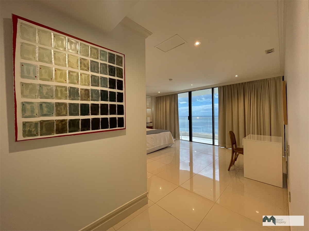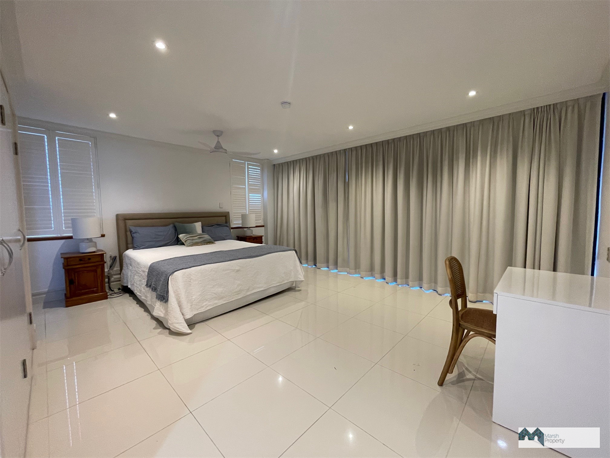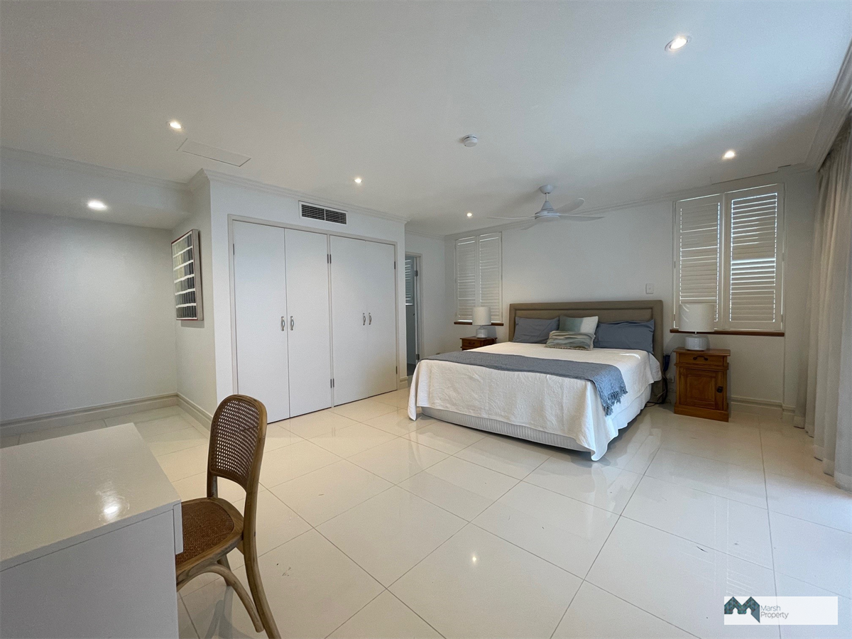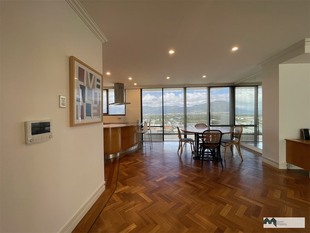 Living areas are on the lower level and feature views of the mountains to the West and the waterfront to the East with elegant parquetry flooring, flowing seamlessly to the expansive main balcony, offering a breathtaking outlook across Trinity Inlet and the Coral Sea, stretching as far as Green Island.