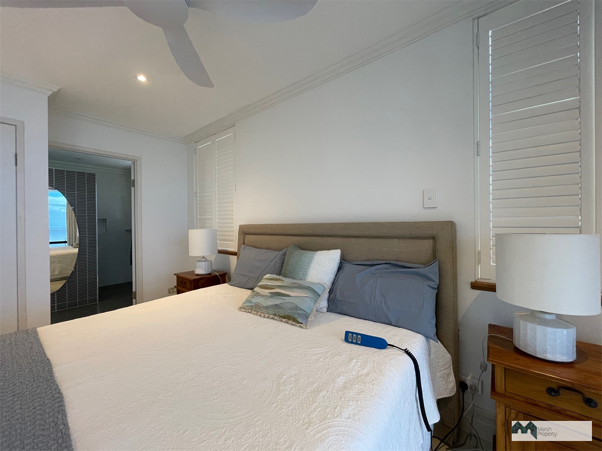 • master bedroom with king bed, ensuite, walk-in robe, and private ocean-view balcony