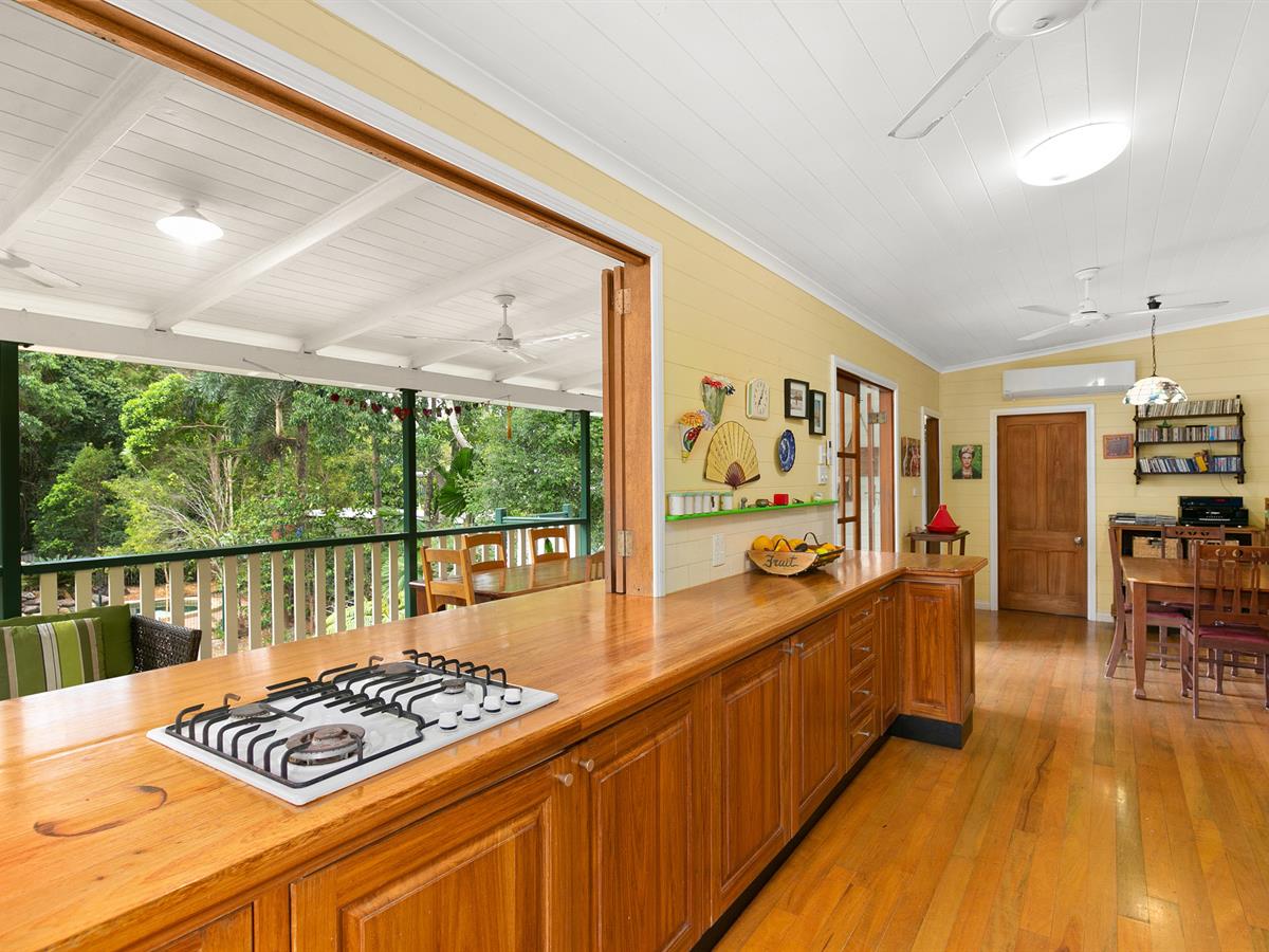Upstairs has three bedrooms and one bathroom with a shower & bath and separate toilet. The main living, kitchen and dining area has a gorgeous timber kitchen with gas cooking & a servery opening onto the large timber deck overlooking the back yard and pool. There is also a separate office, walk in storage room & an enclosed sunroom with casement windows that wraps around on two sides of the property.