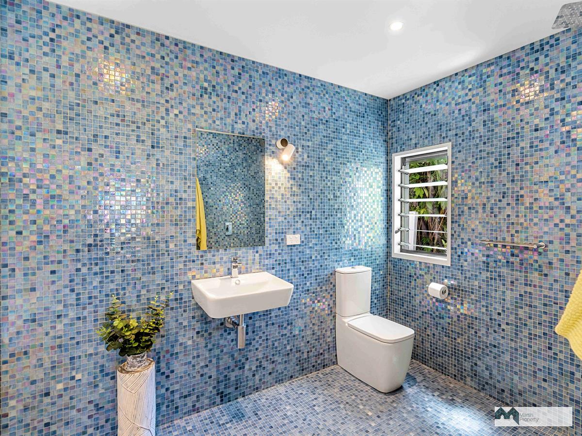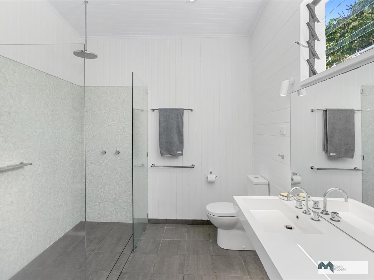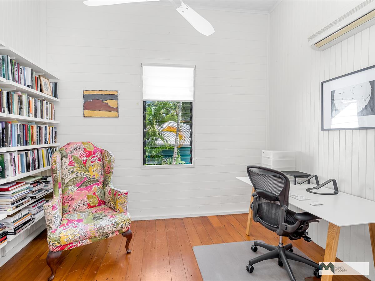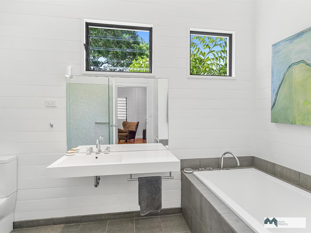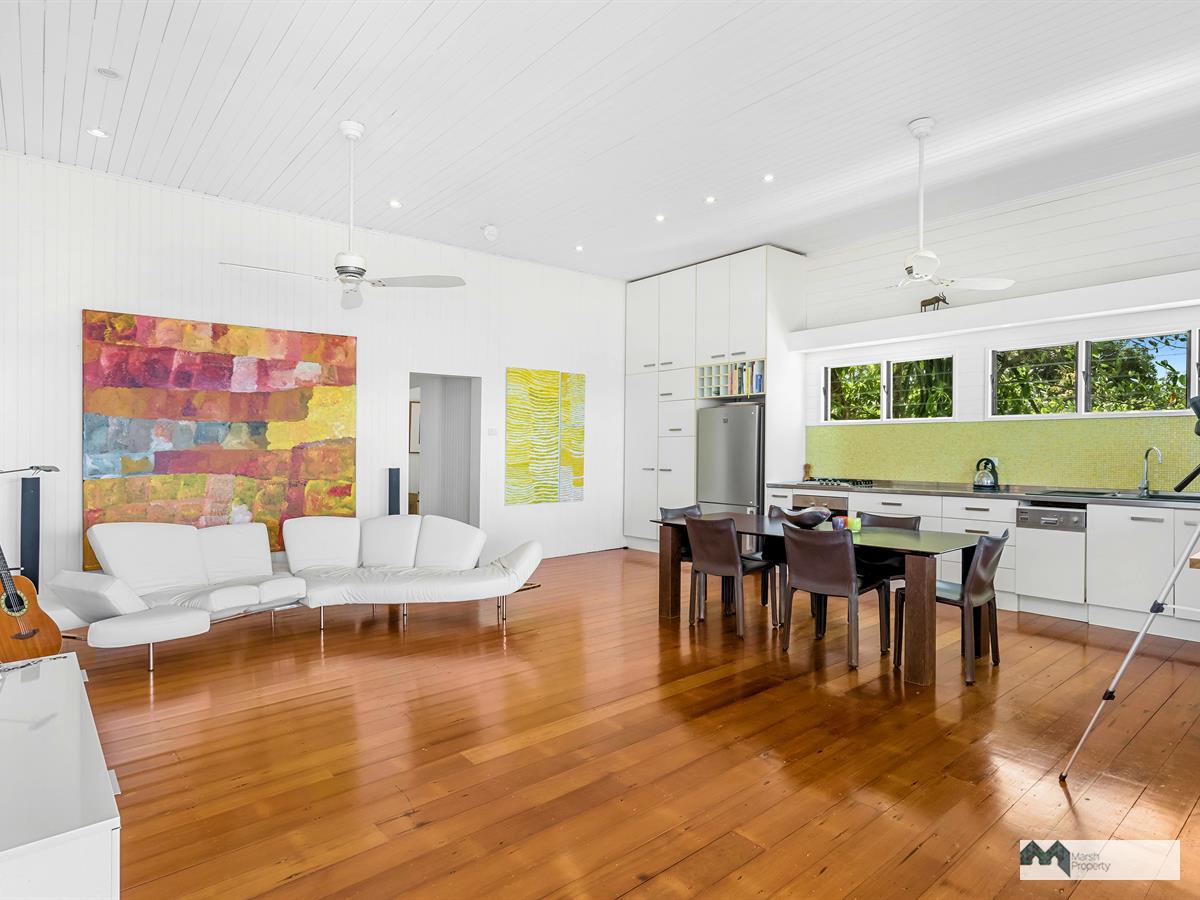 Upstairs is classic open plan Queenslander; hidden structural steel enables large open spaces in which to host magnificent art in a minimalist fashion where your outlook is a living piece art viewed through bi-fold glass doors opening onto an elevated alfresco deck. Fabulous high ceilings in the lounge / kitchen / dining area enhance the sense of volume and three bedrooms, a superb bathroom and a rear deck with park-like views complete the amenity. Council approval for a suspended pool off the rear deck is already in place if desired.