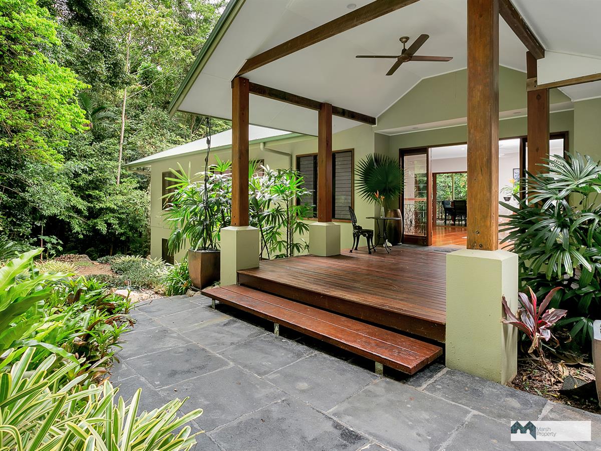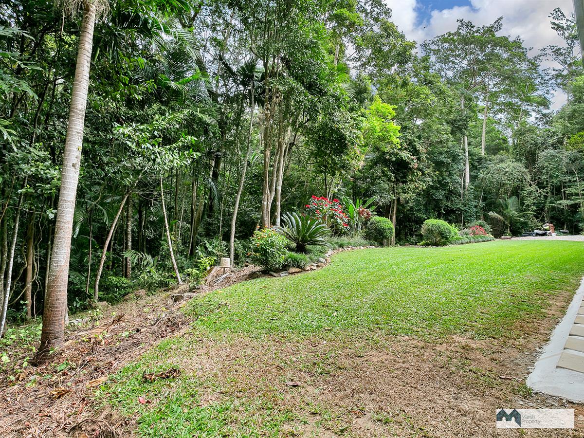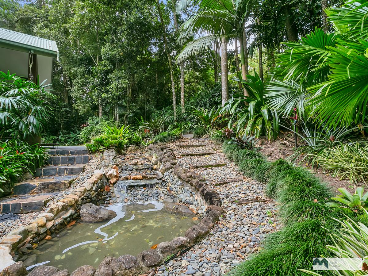 From the moment you step down from the street frontage across a man-made creek trickling over rocks through to a small ‘swimming pond’, the feeling of nature prevails. Surrounded by natural rainforest, beautiful tropical gardens and lawns, this home offers a sanctuary from the worries of the world.