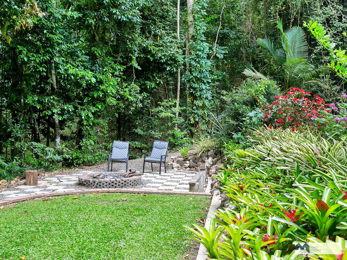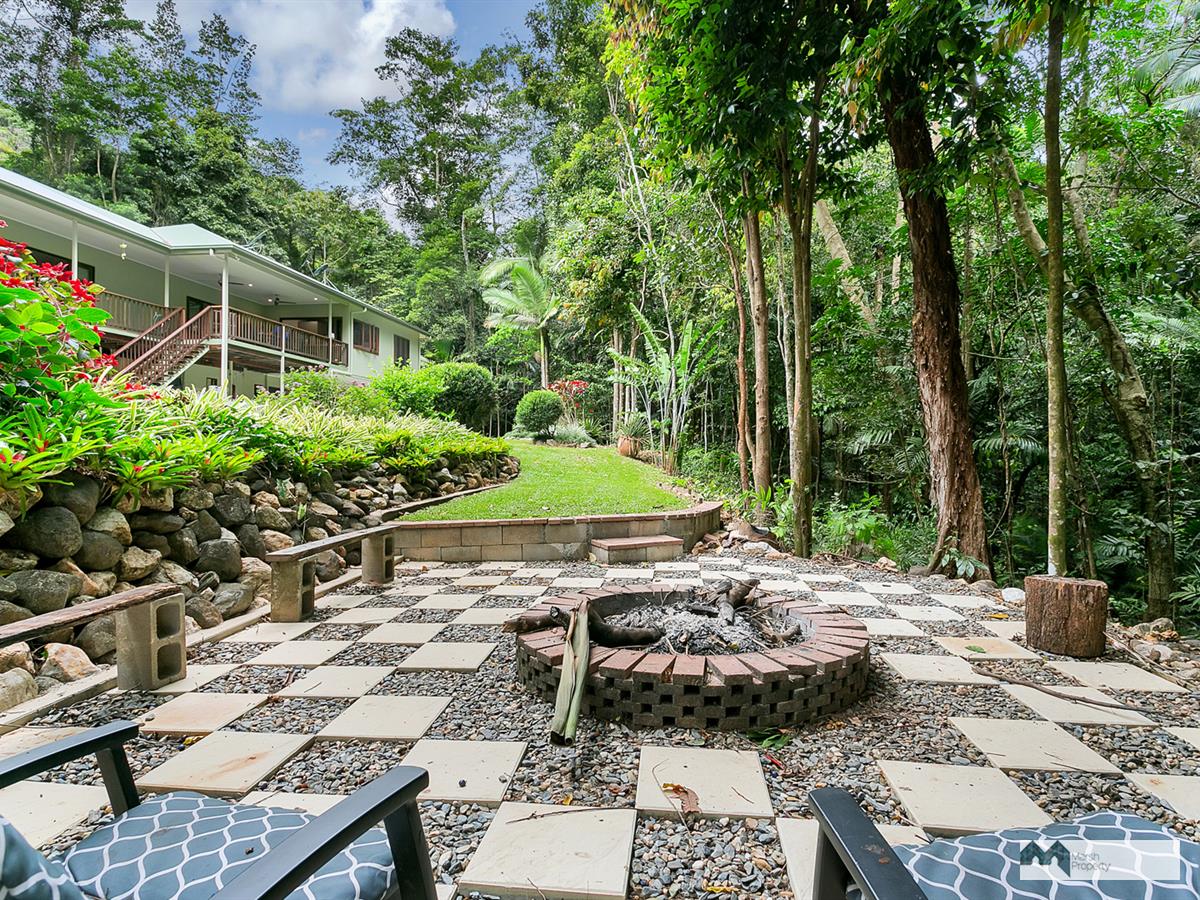 Upstairs, a private master bedroom wing with luxe ensuite and generous walk-in robe and office is set at one end of the home. Two large bedrooms with an adjoining bathroom are set at the opposite end of the open plan central lounge and dining area, which features stunning timber floors. The kitchen features stainless appliances and a broad servery to the alfresco deck also providing seamless service into the dining area and living area. The french doors and an abundance of louvres ensure that the cooling breezes keep the home cool all year around. Year-round indoor/outdoor living really is a standout feature with fabulous views across manicured lawns and a paved area with firepit, right through to the rainforest backdrop.