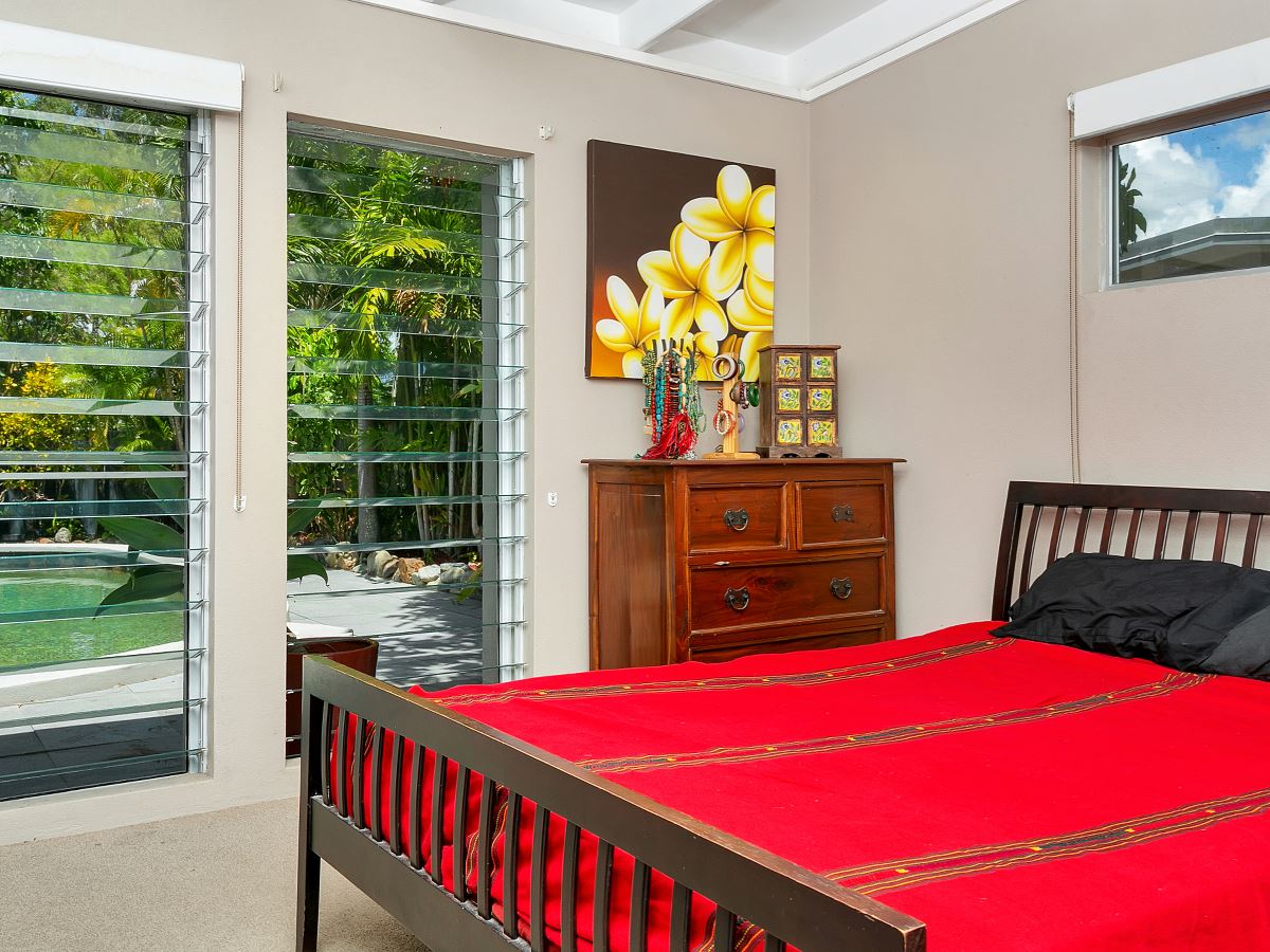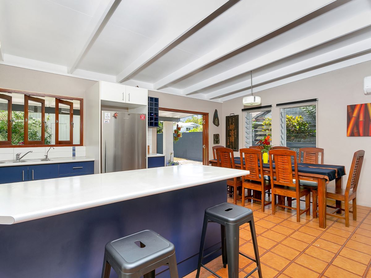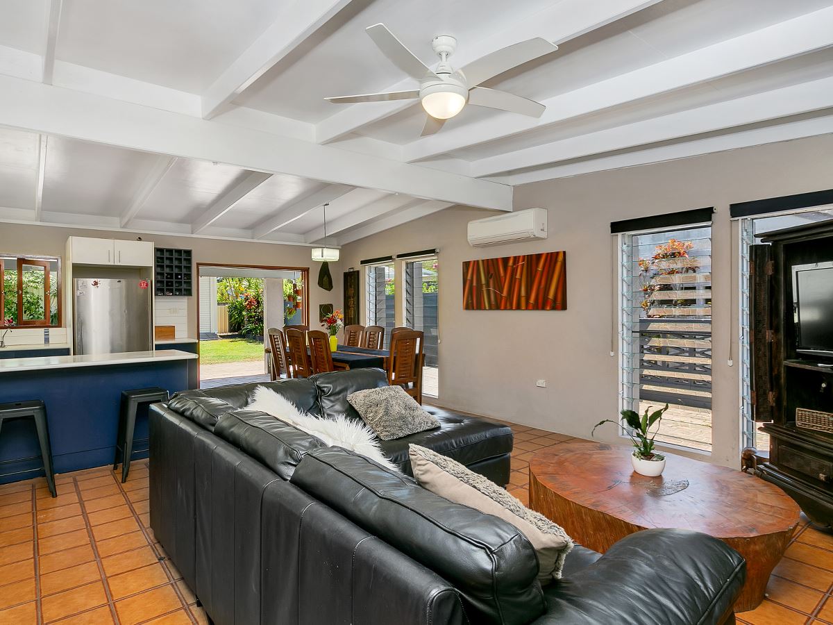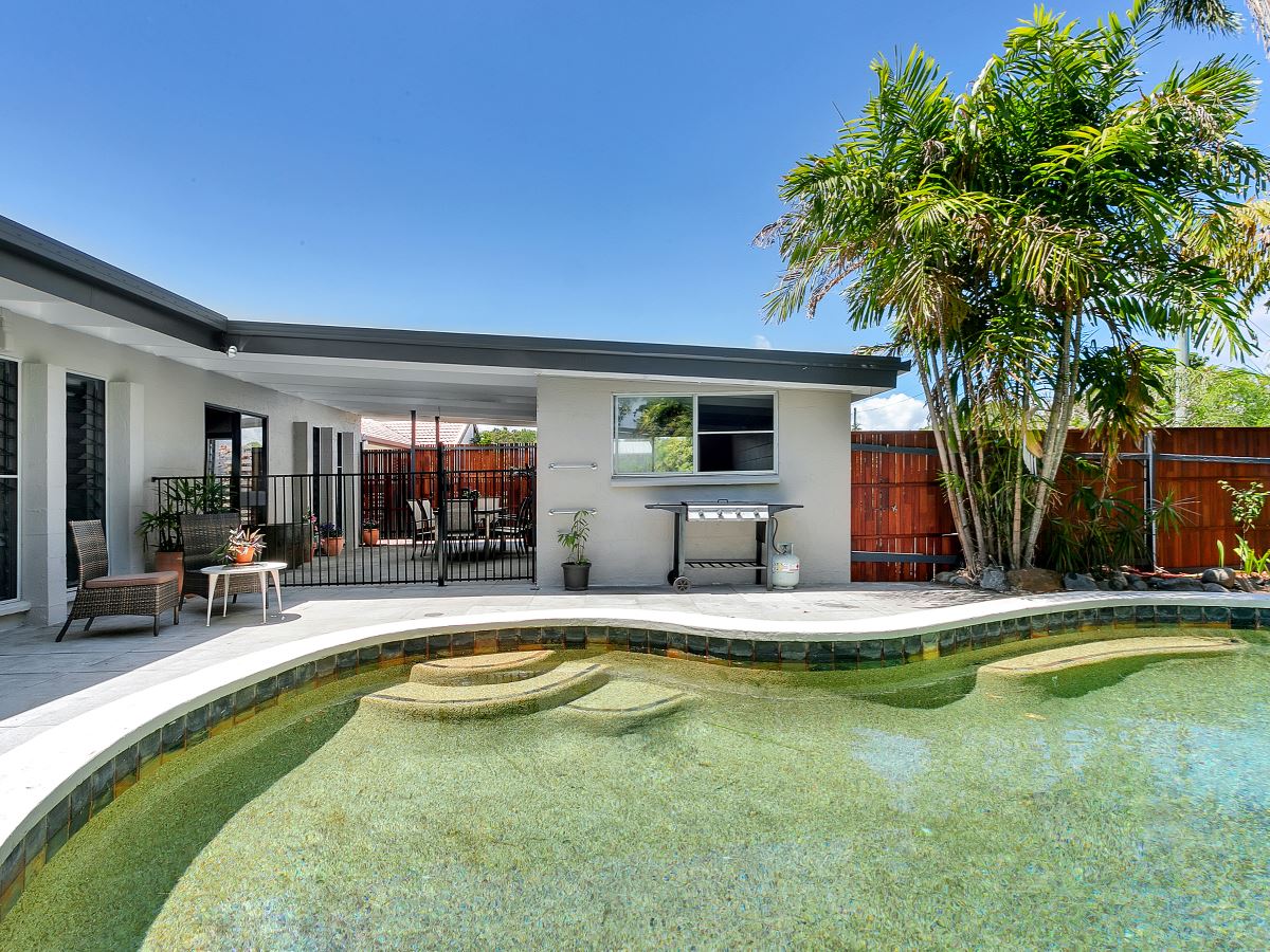 Timber casement windows and lots of glass louvres add tropical style and allow for cooling summer breezes. The home also features undercover outdoor dining over looking the inground pool and bbq area.