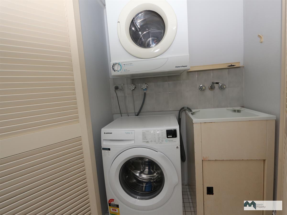 The townhouse features two large bedrooms both with built-in robes and air conditioning, a balcony off the main bedroom, and a spacious living space with private courtyard. White goods are also provided including fridge, washing machine and dryer.