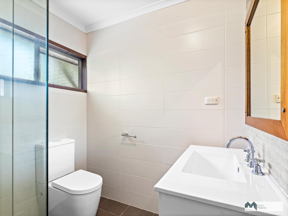 Upstairs, the bedrooms have been fitted with bamboo flooring and timber feature louvre panels. The modern bathroom has floor to ceiling tiles and frameless glass.