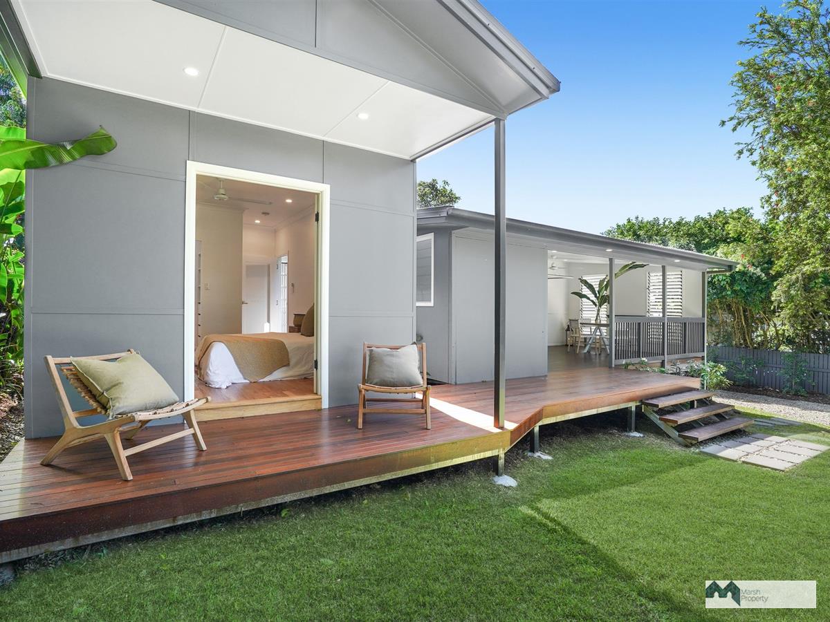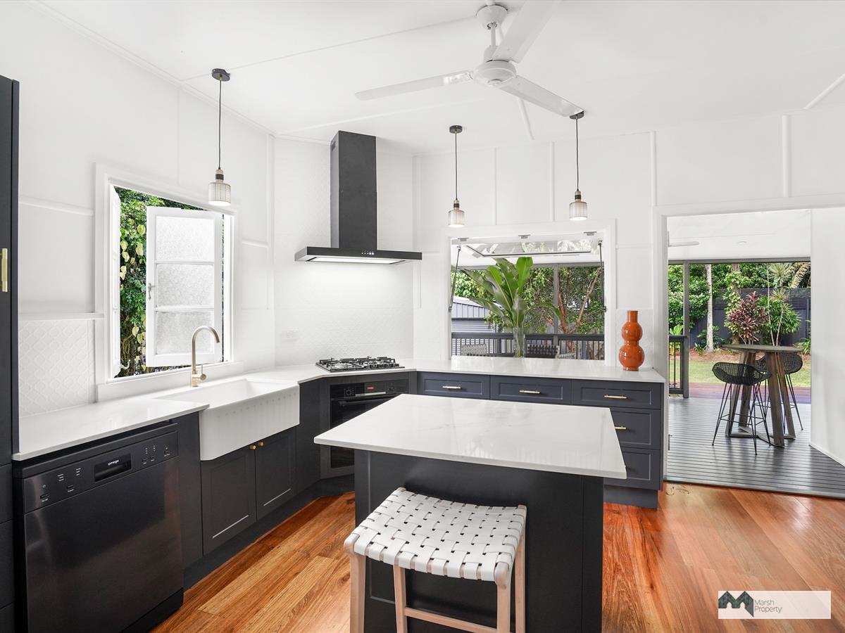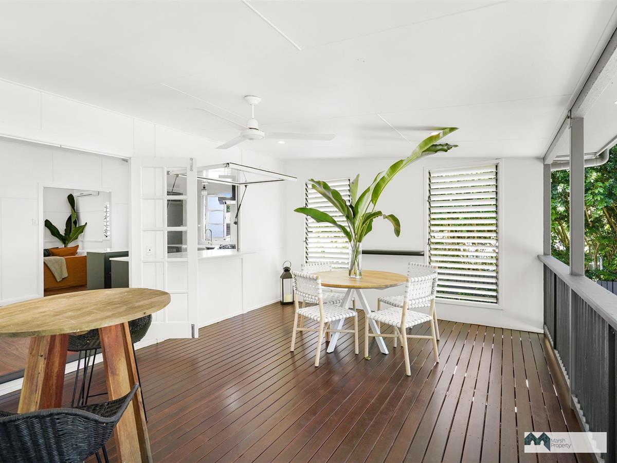 Sitting proudly on an 809m2 block this beautifully renovated cottage features three bedrooms, including new main/studio with ensuite, walk-through robe and dual entry. Lovers of Hamptons style will appreciate the new bathroom and stylish kitchen with a servery opening onto the 100m2 alfresco dining deck overlooking easy care tropical gardens. A generous air conditioned lounge with original high ceilings and gorgeous timber floors is accessed via the street side entry foyer and flows through to the kitchen.