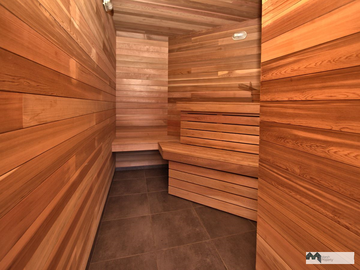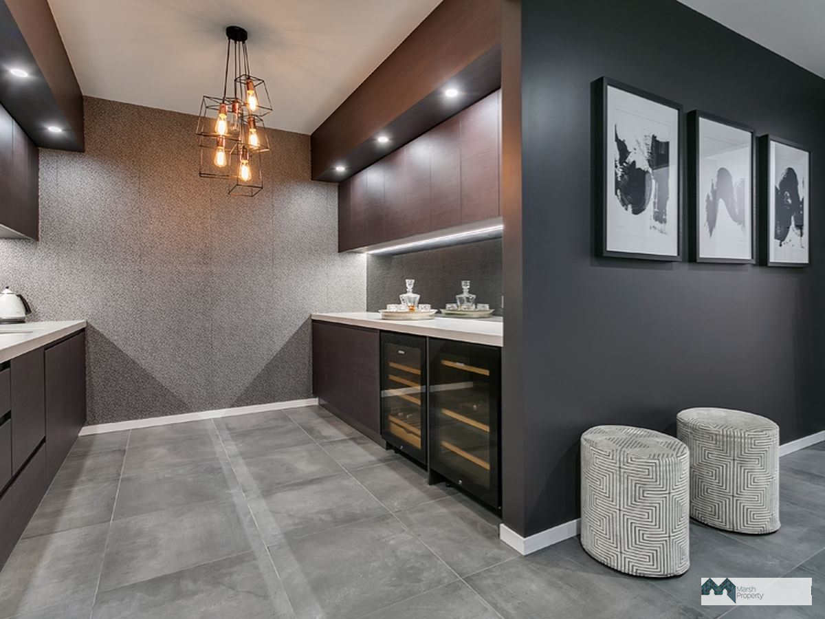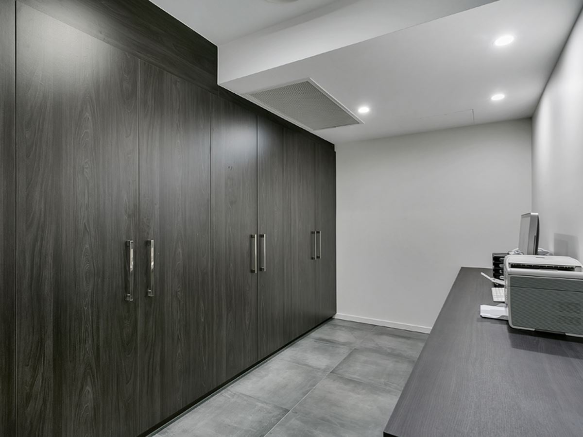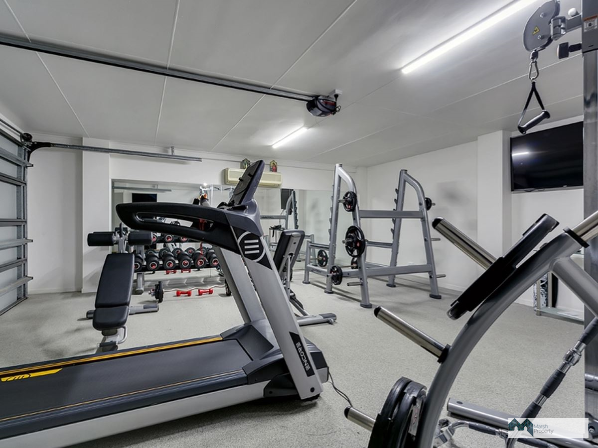 The lower level is almost a mirror image of the upper level layout with a deck pool and spa and a private custom-built sauna. An enormous entertaining space replete with ¾ sized snooker table and a butler’s pantry, will be the envy of all with double, glass fronted Vintec wine fridges and stone benches. An adjoining study provides the perfect place for home based business and the luxe finish rolls through to the two lower bedrooms; one of which has a beautiful ½ egg stand-alone bath. For the health conscious, a 40sqm fully equipped gymnasium will satisfy the most avid of fitness buffs.