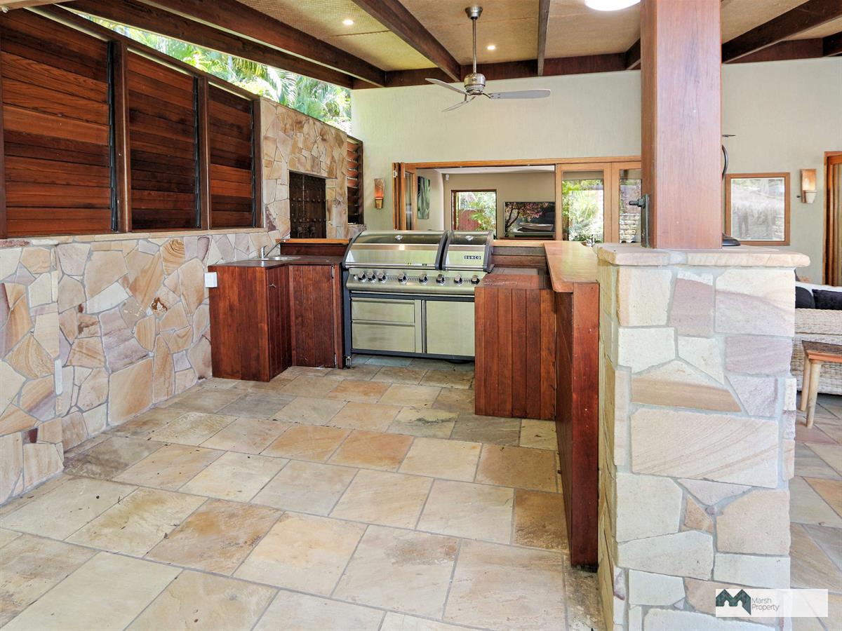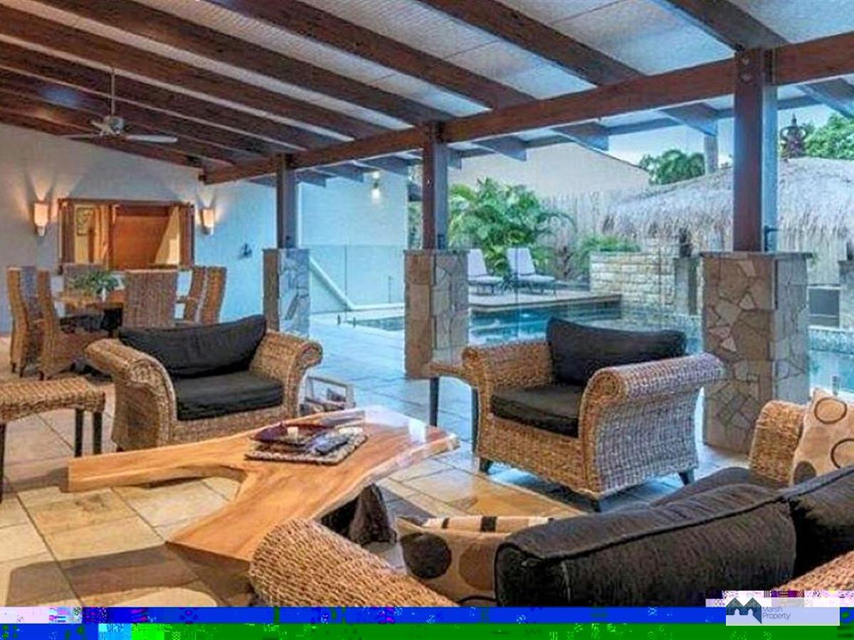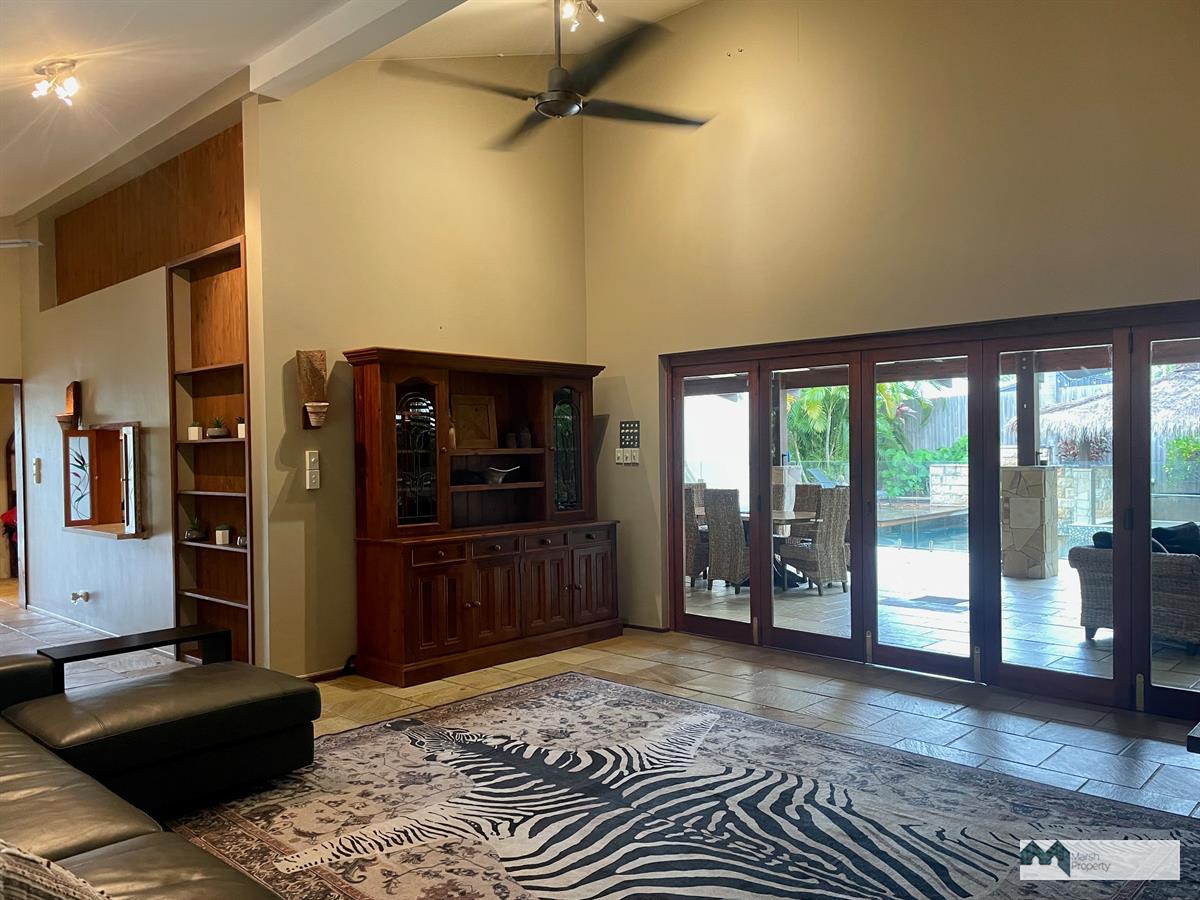 Characterised by first class quality and style, this expansive home exudes a quiet understated tribal vibe enhanced by Indonesian inspired features. The perfect place for the world weary to relax and recharge. It features a massive pool with swim-up bar beneath a thatched pavilion adjacent a huge undercover entertaining patio replete with built-in BBQ / outdoor kitchen. Internal to this patio through timber bi-fold doors is an open plan dining / living area with beautiful natural sandstone flooring and high ceilings. This is all serviced by a highly functional New Guinea Rosewood kitchen with serveries to both the internal dining area and outdoor patio.