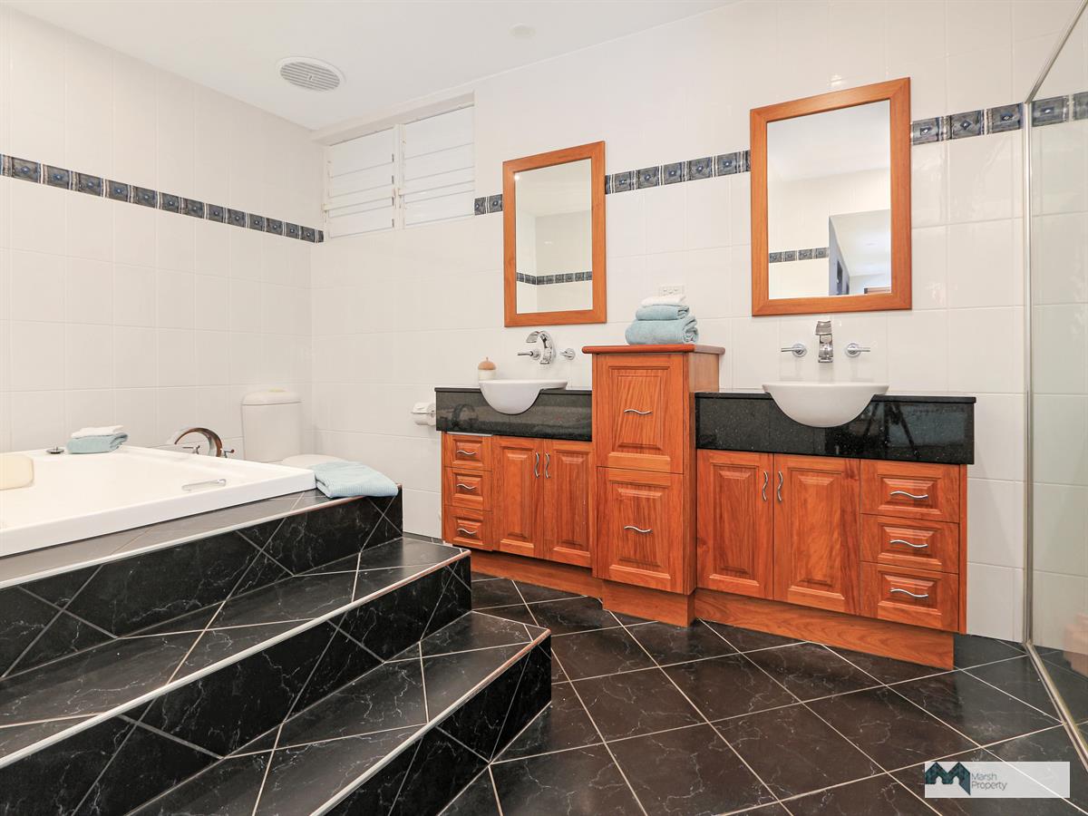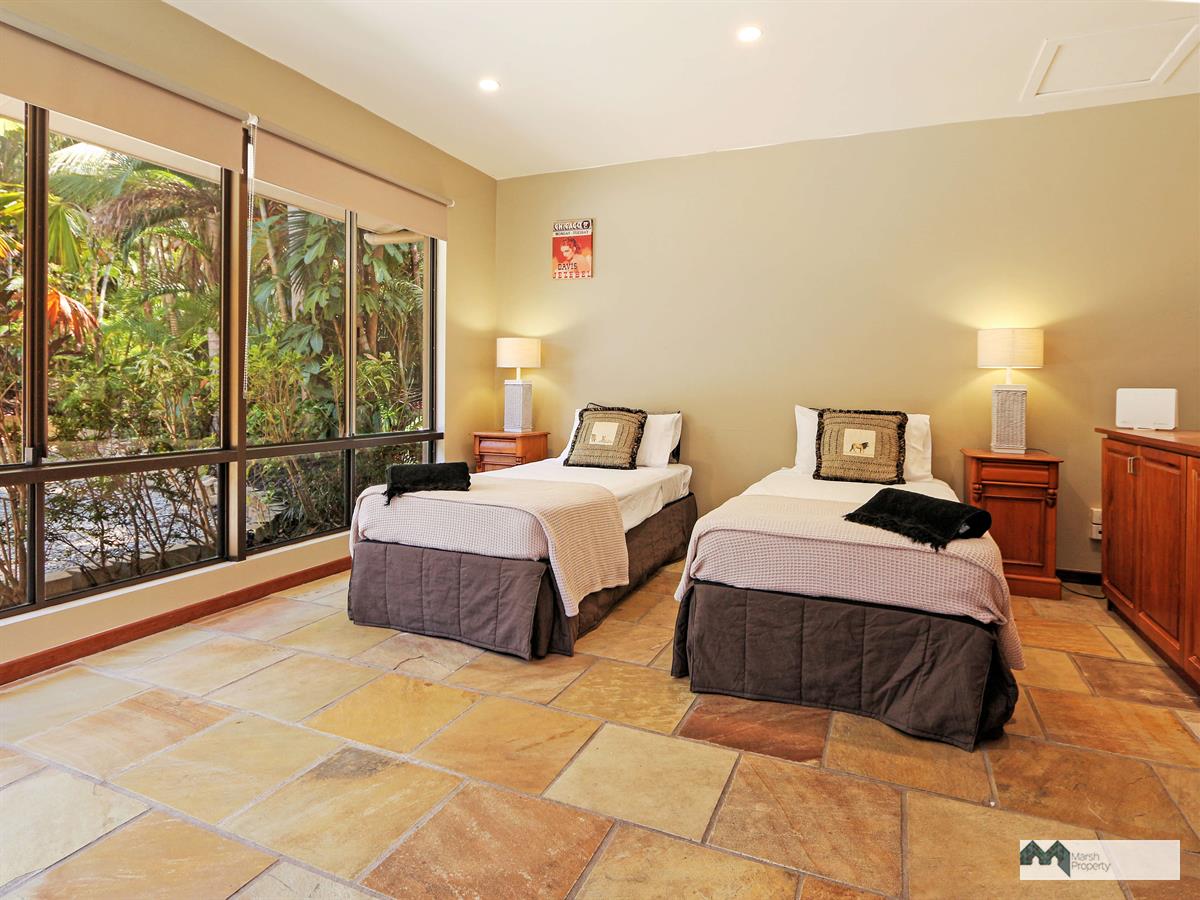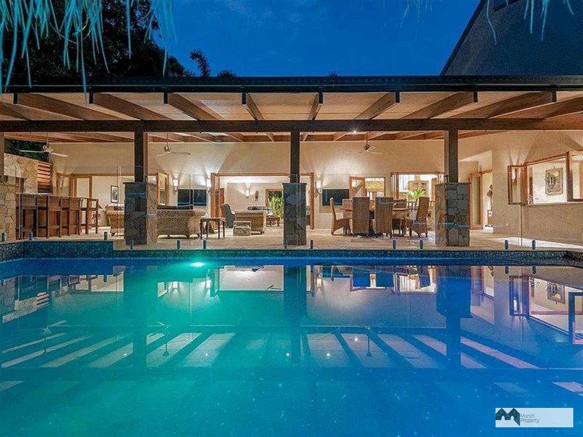 Characterised by first class quality and style, this expansive home exudes a quiet understated tribal vibe enhanced by Indonesian inspired features. The perfect place for the world weary to relax and recharge. It features a massive pool with swim-up bar beneath a thatched pavilion adjacent a huge undercover entertaining patio replete with built-in BBQ / outdoor kitchen. Internal to this patio through timber bi-fold doors is an open plan dining / living area with beautiful natural sandstone flooring and high ceilings. This is all serviced by a highly functional New Guinea Rosewood kitchen with serveries to both the internal dining area and outdoor patio.