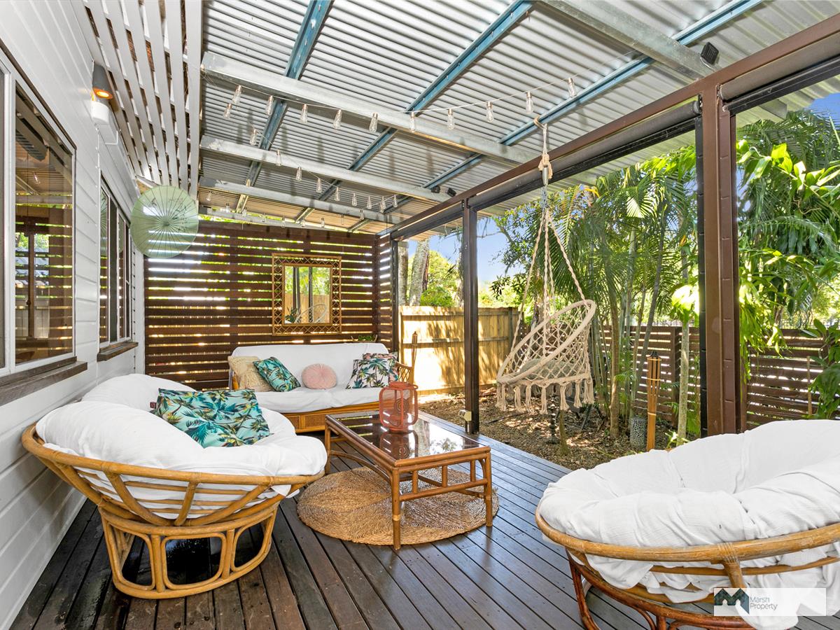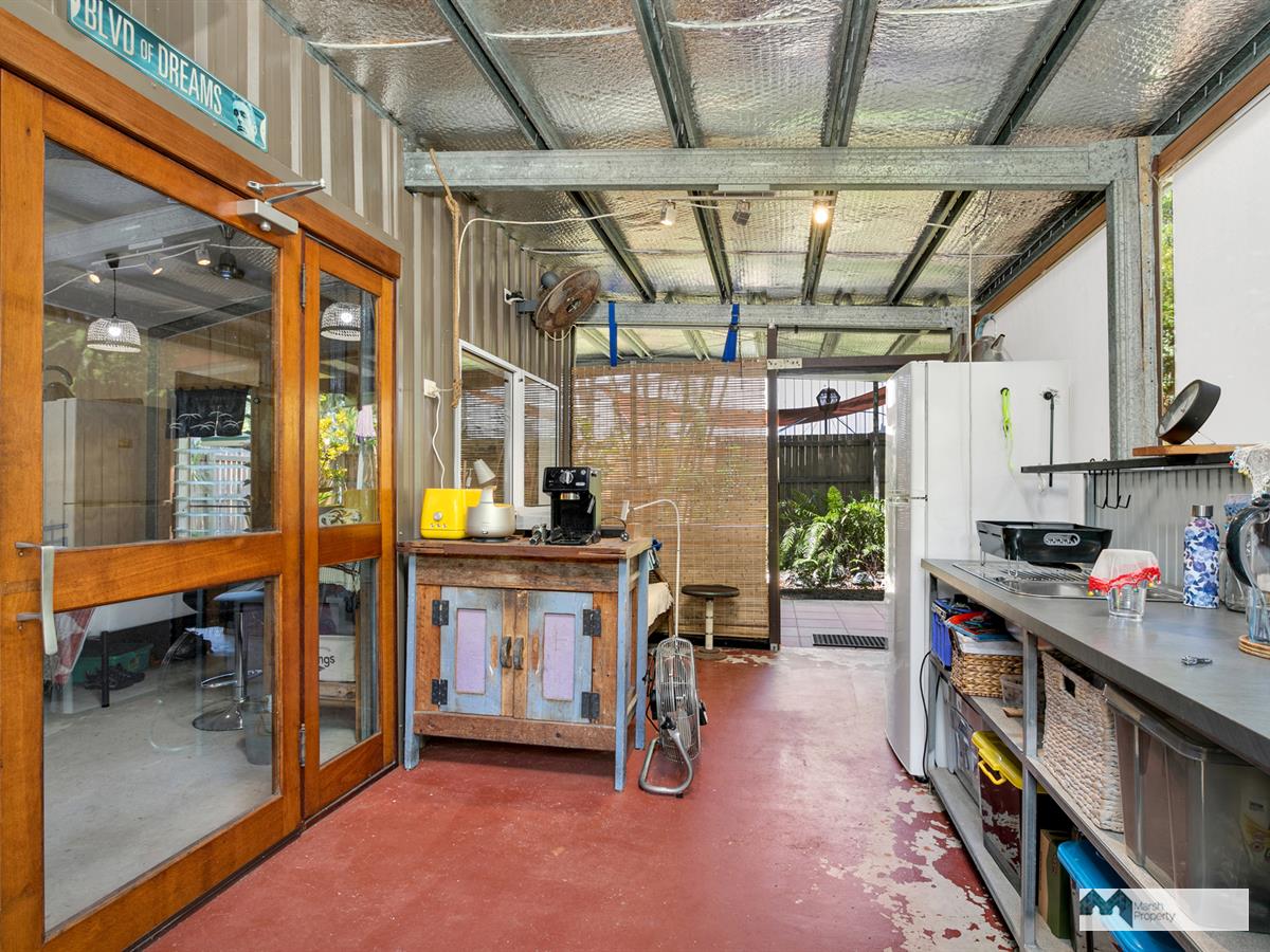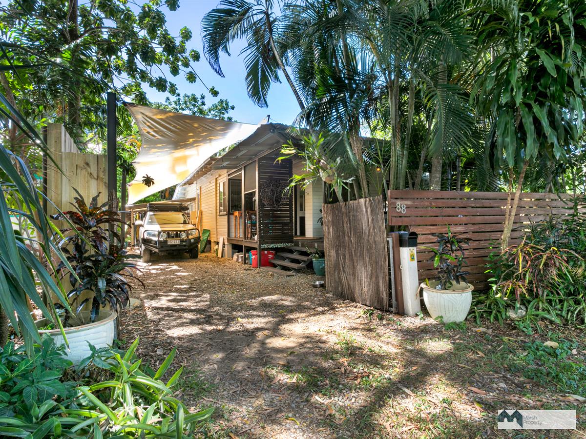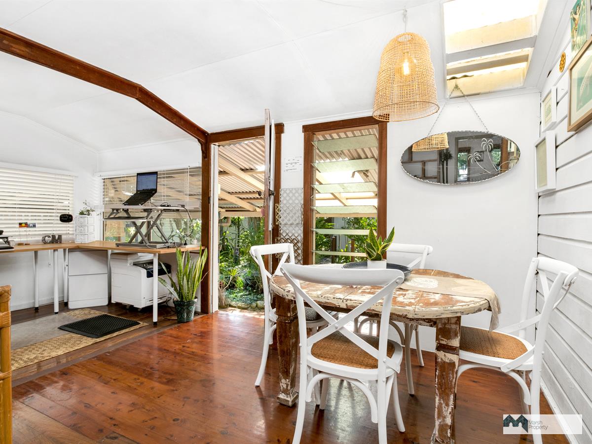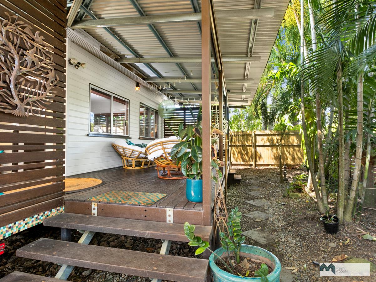 Two bedrooms, office space, open plan kitchen & lounge, a delightful wet bathroom with bath, a fabulous screened front verandah for dining or lounging plus a rear outdoor patio area overlooking the fish pond are just some of the features you will immediately engage with. There is even an outdoor shower cleverly & privately tucked against the side of the house, overlooking the fabulous tropical back gardens featuring a small gazebo style day bed.