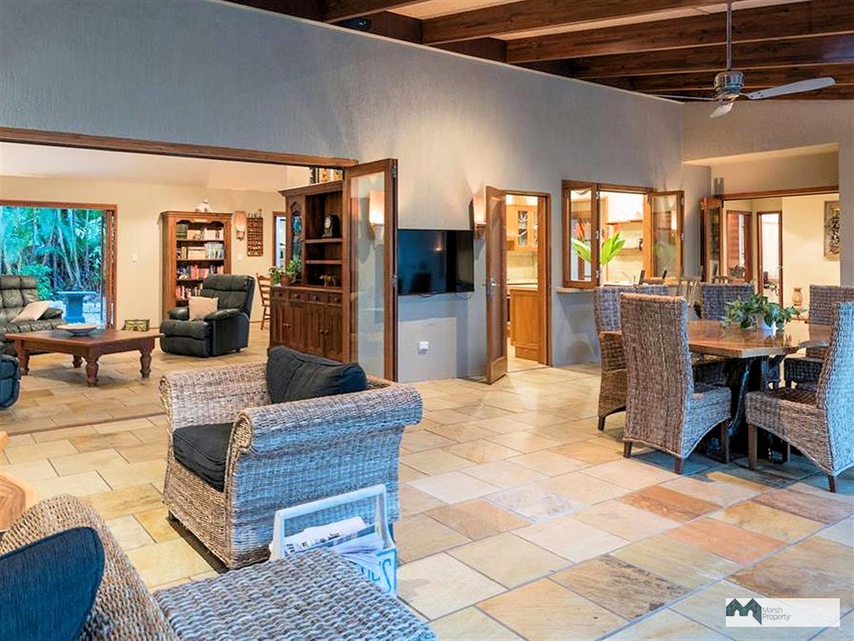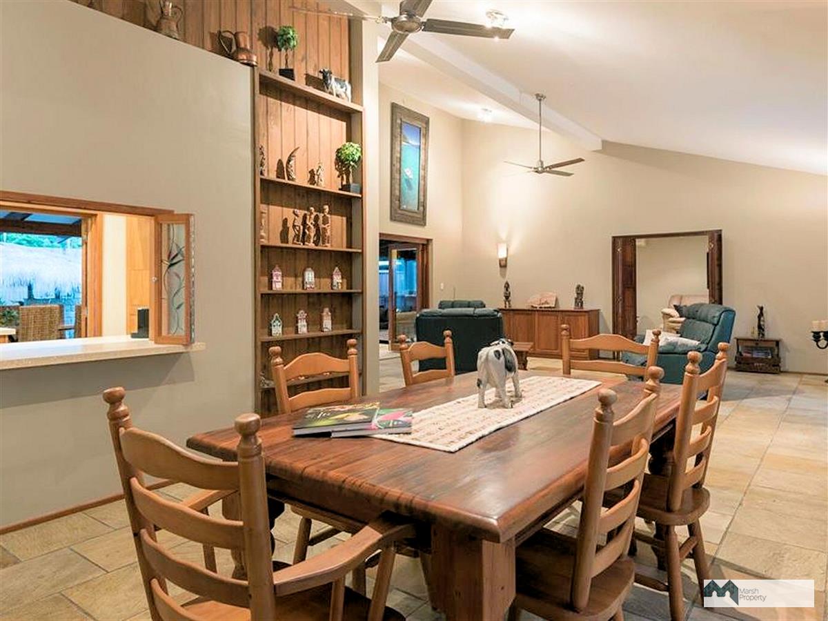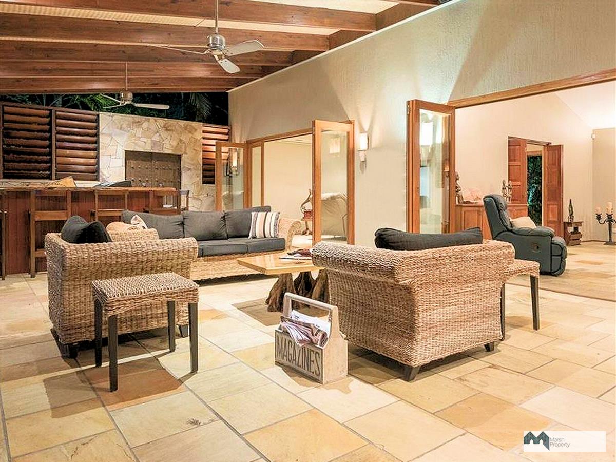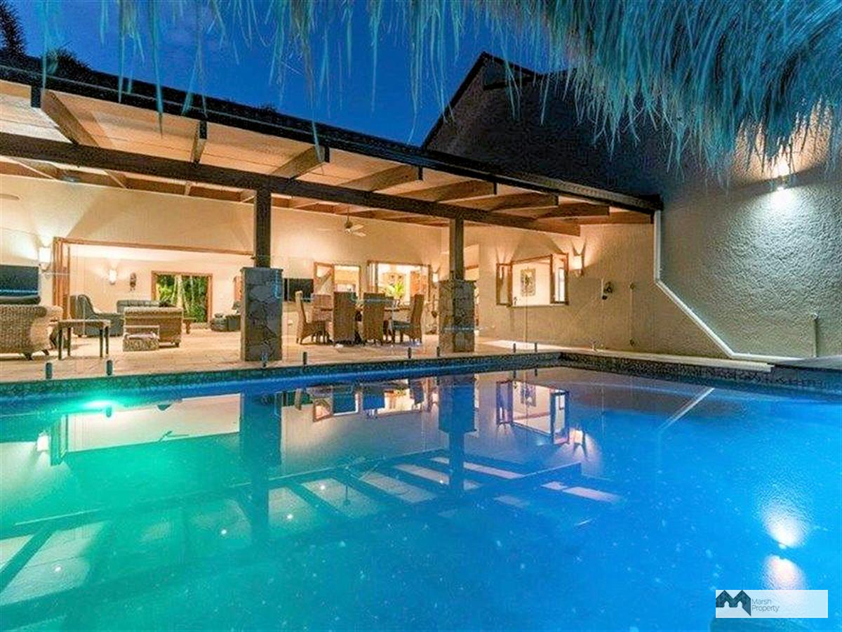 Characterised by first class quality and style, this expansive home exudes a quiet understated tribal vibe enhanced by Indonesian inspired features. The perfect place for the world weary to relax and recharge. It features a massive pool with swim-up bar beneath a thatched pavilion adjacent a huge undercover entertaining patio replete with built-in BBQ / outdoor kitchen. Internal to this patio through timber bi-fold doors is an open plan dining / living area with beautiful natural sandstone flooring and high ceilings. This is all serviced by a highly functional New Guinea Rosewood kitchen with serveries to both the internal dining area and outdoor patio.