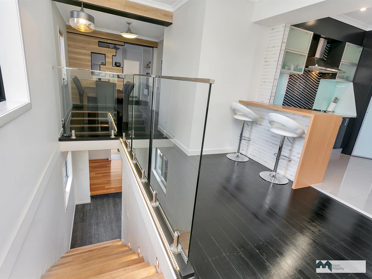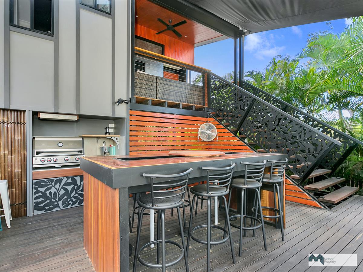 Upstairs is accessed via a modern staircase featuring timber treads, soft wall lighting and glass balustrading leading through to the sleek, open plan kitchen/dining area. All four upstairs bedrooms have double glazing and newly installed airconditioning. A second upstairs deck creates additional outdoor lounging space and overlooks the low maintenance back yard and tropical gardens.