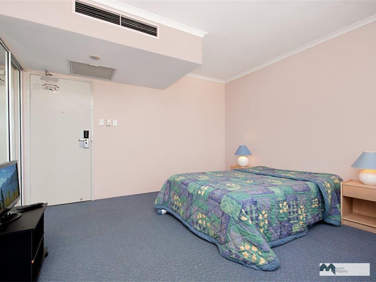 The generous studio with its own private balcony overlooking the mountains includes a kitchenette built in wardrobe and a good sized bathroom with over bath shower and vanity and toilet.
