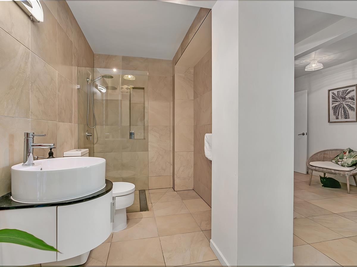 Upstairs features two more bedrooms including a huge master suite complete with walk in robe, terrazzo ‘egg bath”, double marble vanity and a beautiful private ocean view balcony accessed via bifold doors.