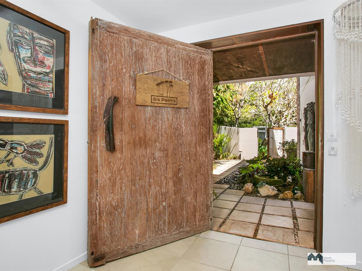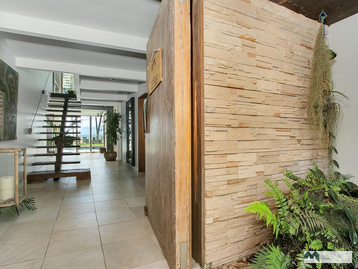 The street entry (opposite Redden Island nature reserve) makes a statement with a giant frangipani tree shading the louvred front entry gate, leading to a tropical courtyard garden & unique, oversized teak front door.