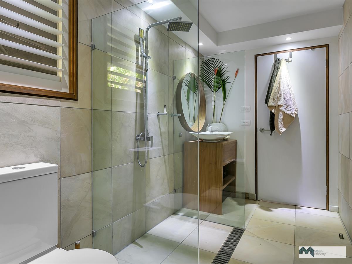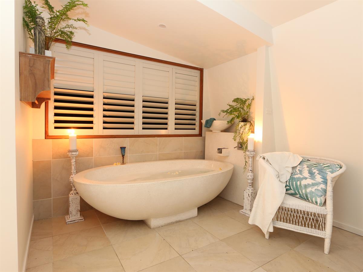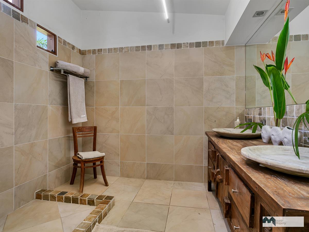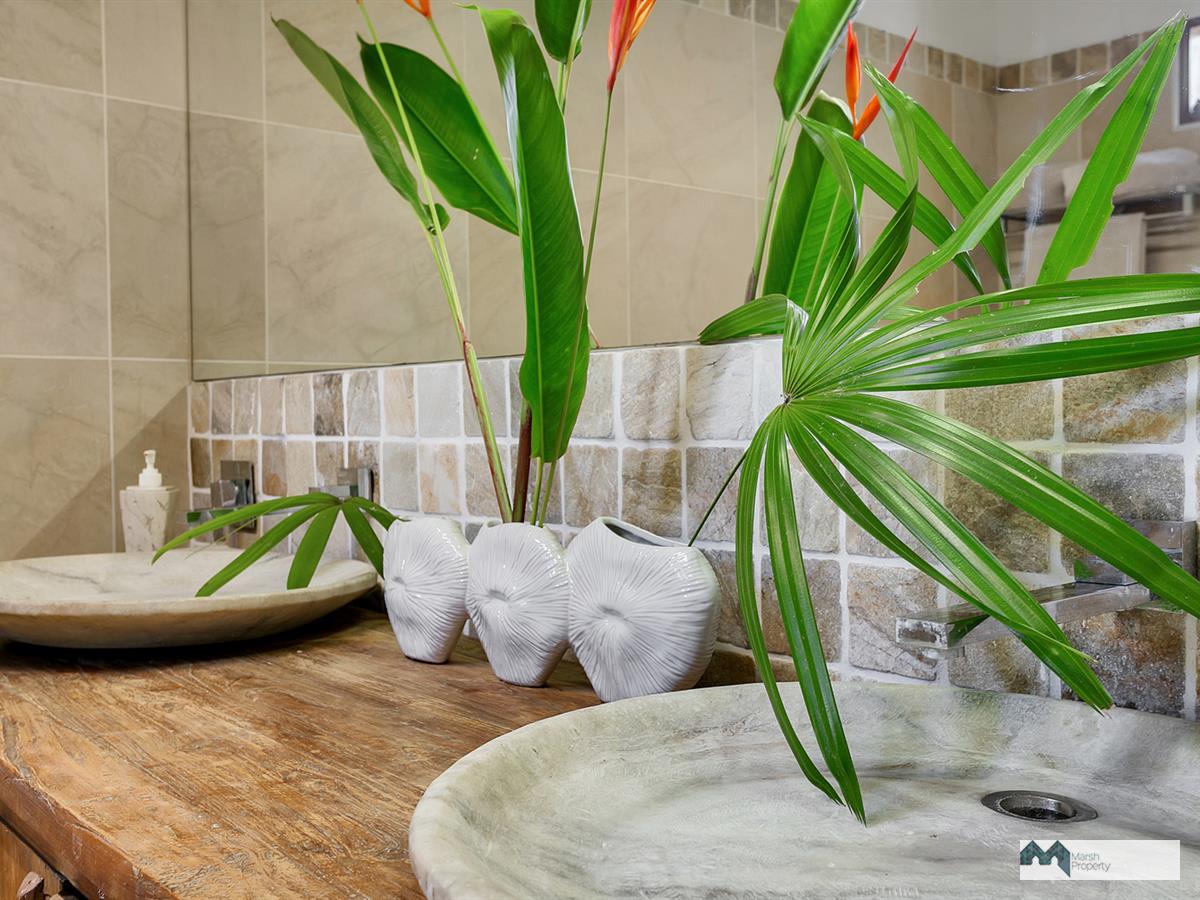 The upstairs area continues the cool tropical organic theme, with natural stone look porcelain tiles & cool white walls softened with unique and unexpected teak timber touches.