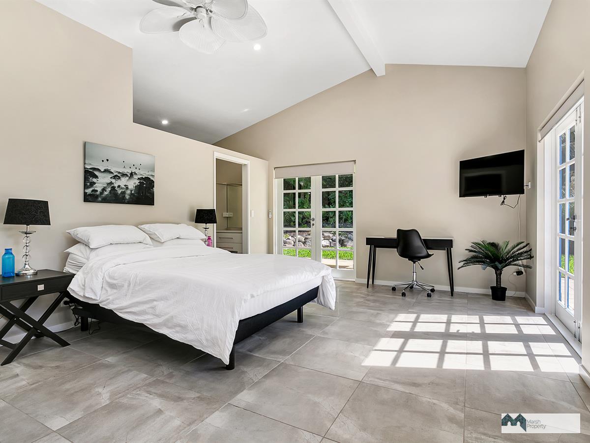 The chef designed kitchen incorporates a large walk-in pantry and generous breakfast bar around the dark granite benchtop, much like a teppanyaki bar. Large format tiles throughout the home help create the feeling of space, which is further enhanced by soaring cathedral ceilings.