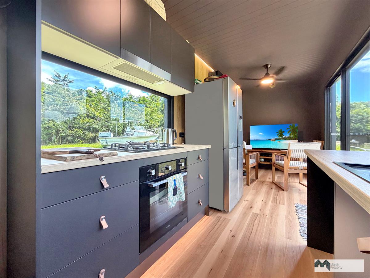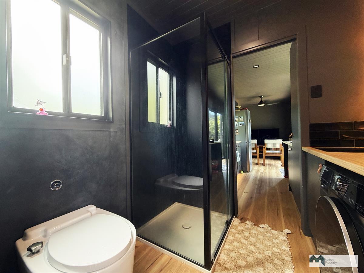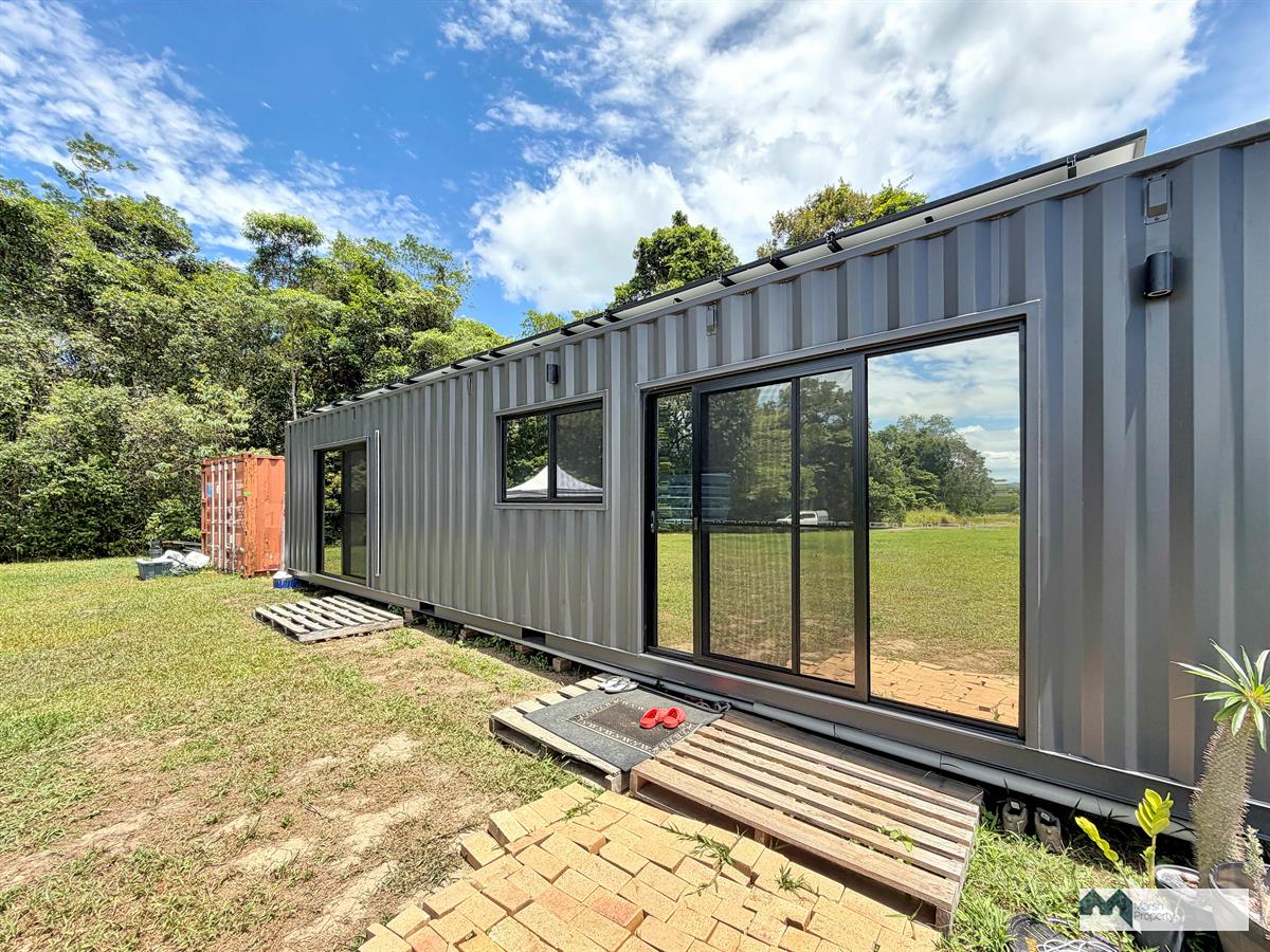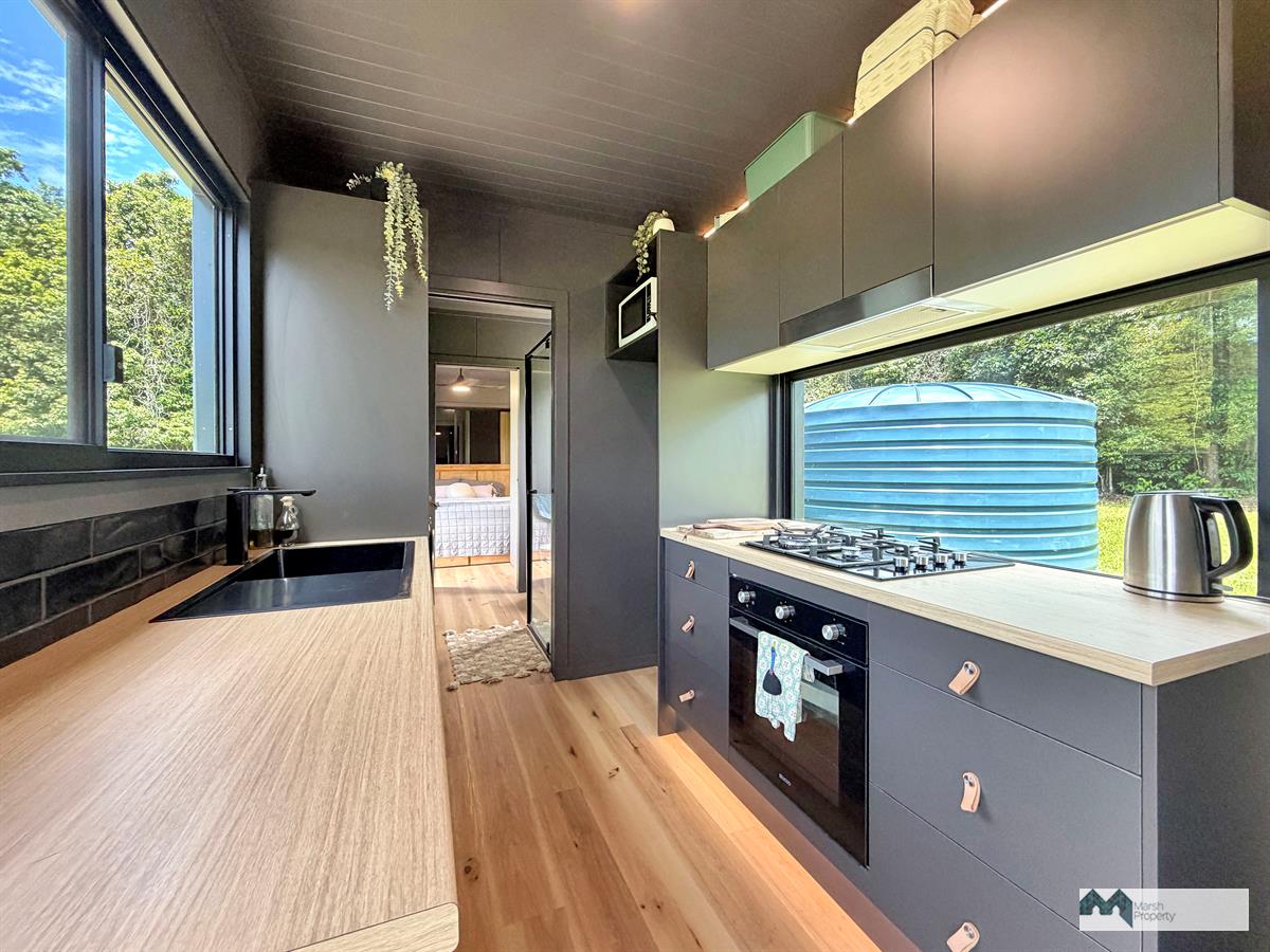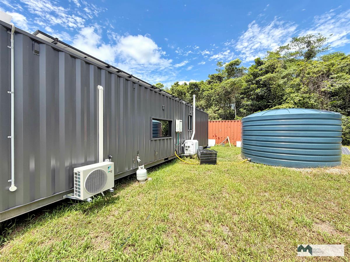 The property is established for off-grid living, featuring a 40ft (12m x 2.4m) tiny home atop solid concrete footings and fully connected to solar power, water, and gas, offering a functional and self-sufficient setup.