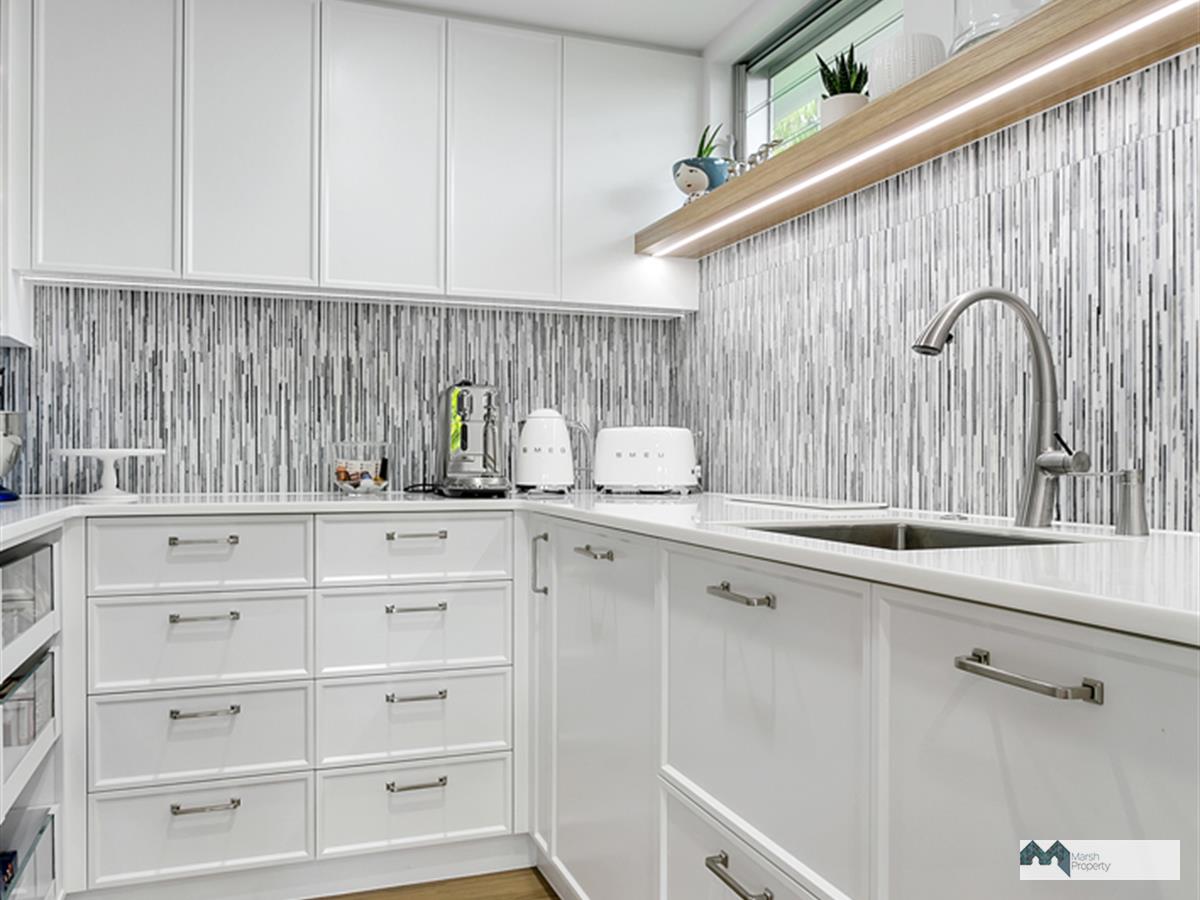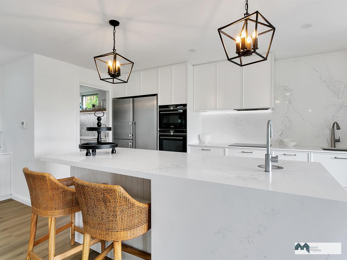 Nestled beyond a high-hedged frontage for privacy and immersed in stunning gardens planted over 1,334sqm, this elegant home has been expertly recreated as a contemporary family haven, with spectacular resort-style entertaining options on both the front south east facing patio and the cosy rear courtyard. Set against a lush leafy backdrop and an internal, glass enclosed pond, the expansive open plan living and dining area is served by a sleek gourmet kitchen appointed with white stone benches, European appliances, filtered Zip tap and a butler’s pantry with discreet under-shelf lighting.