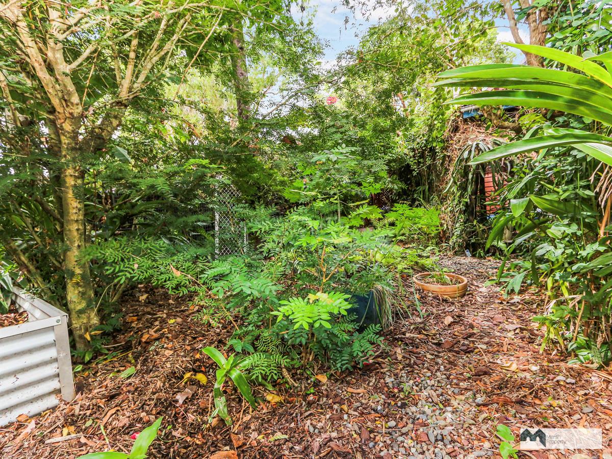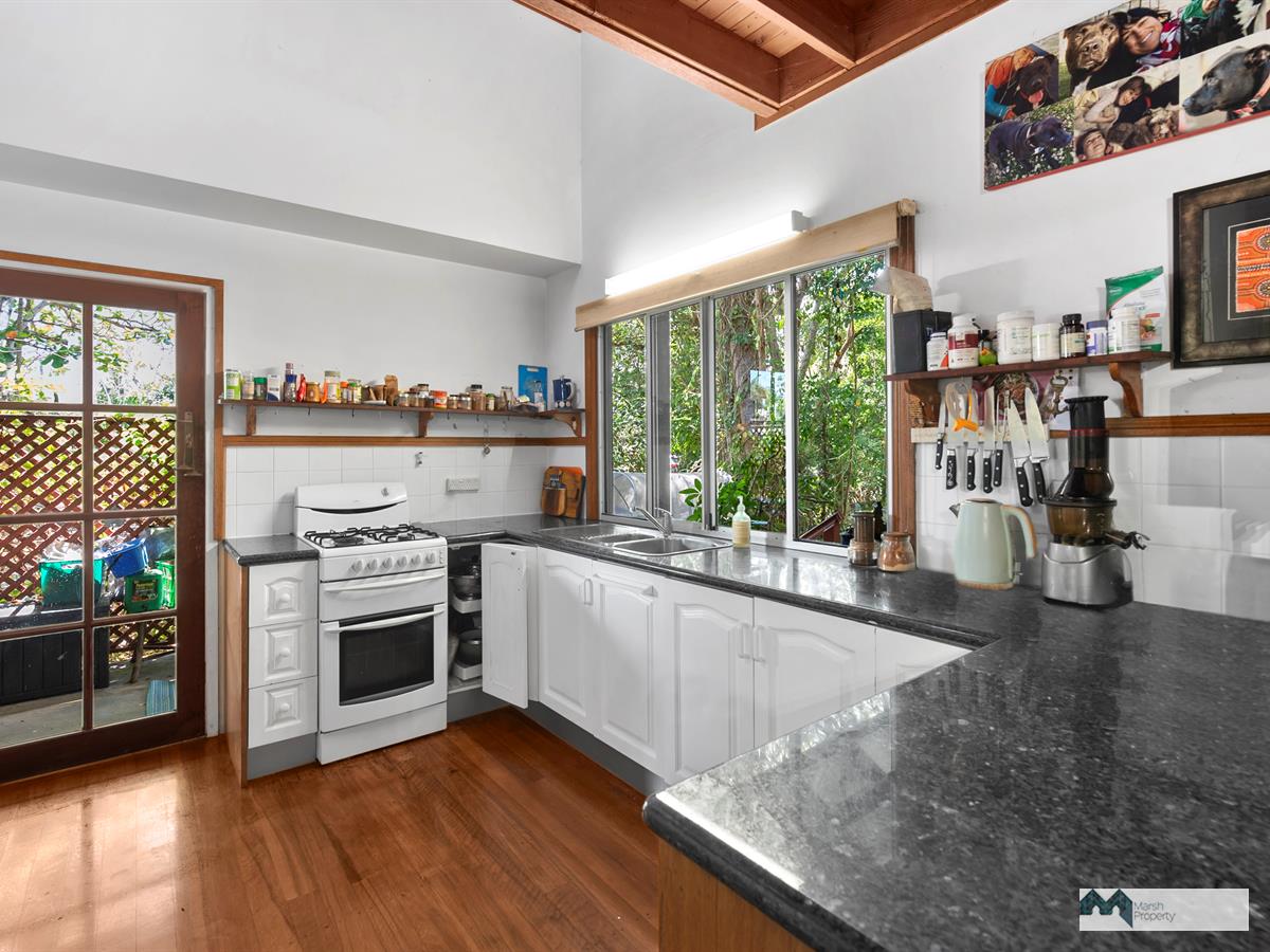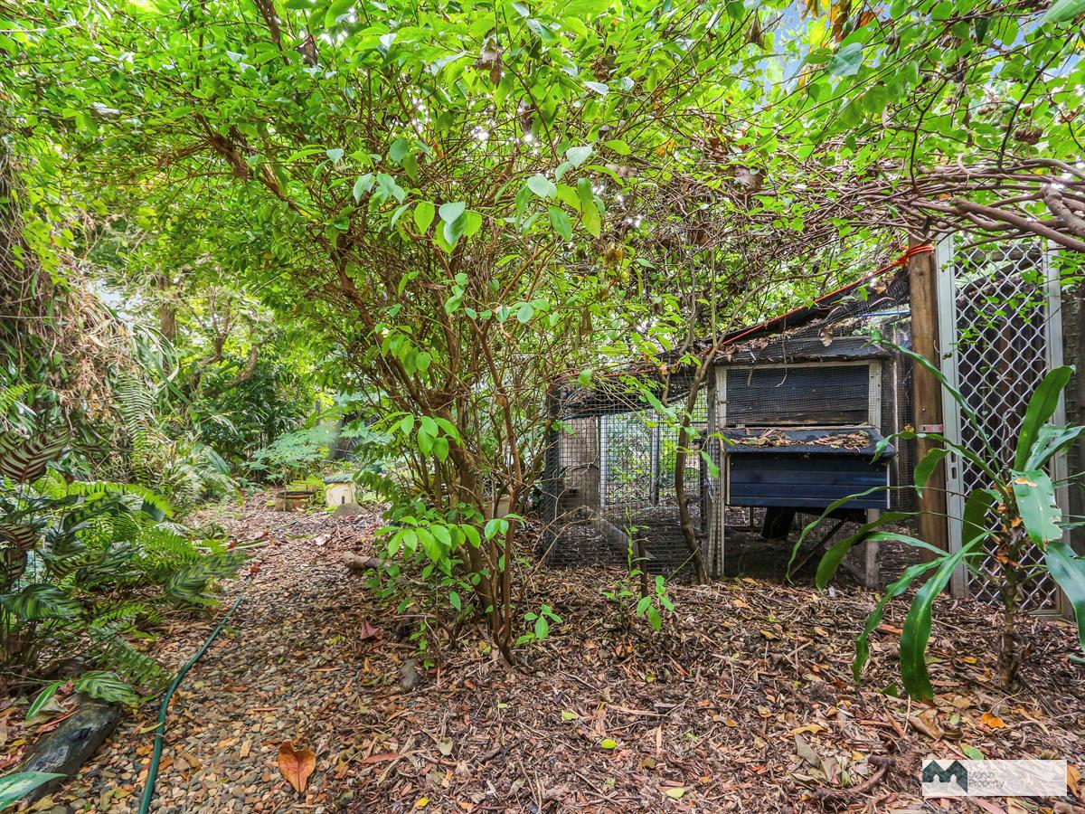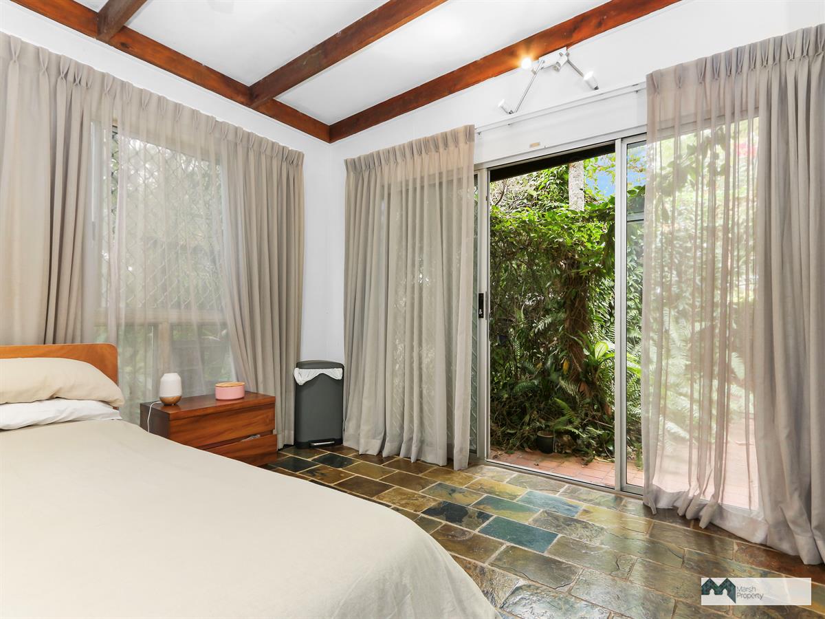 The house sits comfortably in the middle of the 539m2 block and is virtually hidden from the street behind established trees and tropical plantings. It is approached via a raised timber deck which opens into a spacious lounge / dining room and adjacent kitchen. The three bedrooms downstairs all have magnificent views into gardens with green walls of passionfruit and butterfly vines; a secluded piece of paradise.