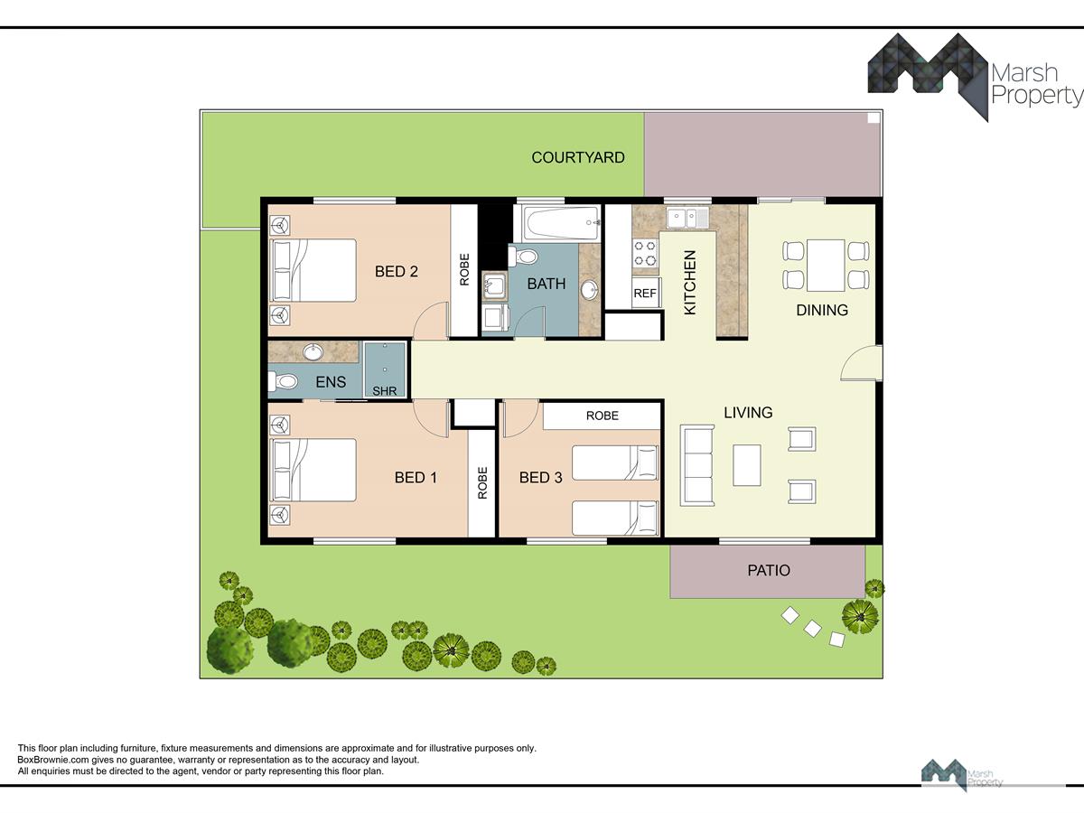 - Floor plan provided including fixtures, furniture and dimensions are approximate and for illustrative purposes only. Marsh Property gives no guarantee, warranty or representation as to the accuracy and layout.