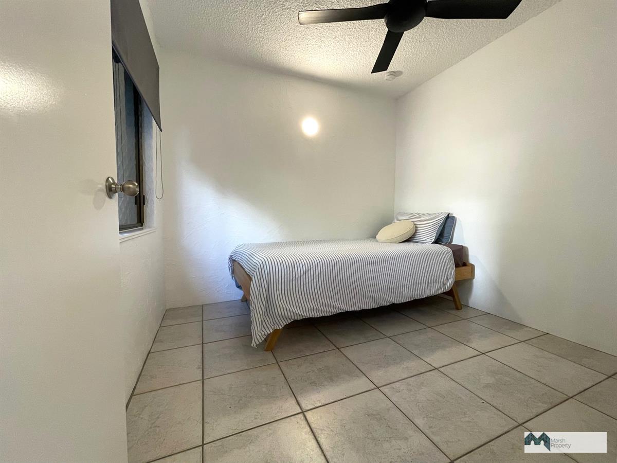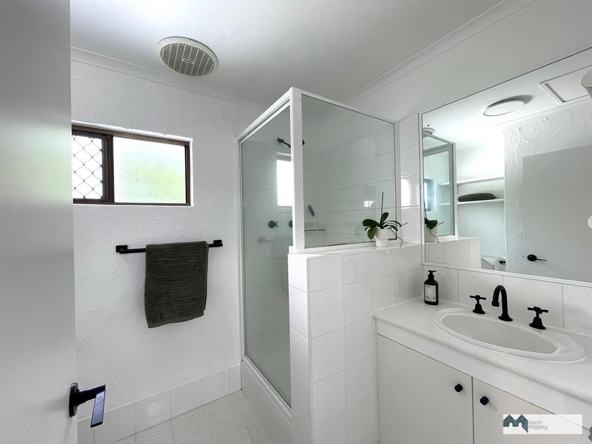 Upstairs, the main bedroom enjoys a breezy outlook, bringing natural light and a distinctly tropical style. The modern bathroom exudes elegance, with a neutral palette of white tiles and glass. Downstairs, the second bedroom is perfect as a guest room or home office.