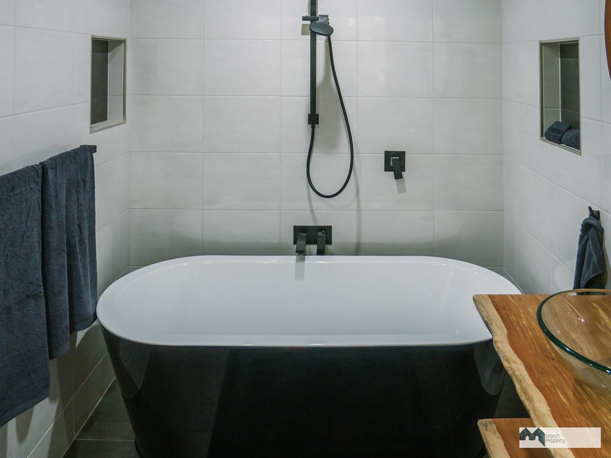 The spacious bathroom features oversized robes for additional storage & a free standing bath with rain shower.