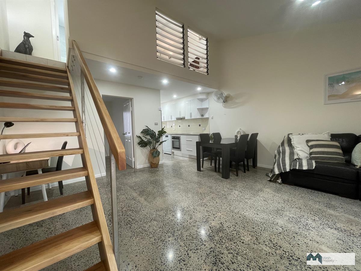 The timber stairs to the upstairs mezzanine level form a stunning central focus in the open plan living area. The master bedroom overlooks the downstairs lounge through cool white louvres which enhance the tropical ambience. A double shower complements the fully tiled bathroom upstairs and a new full laundry is incorporated into the carport.