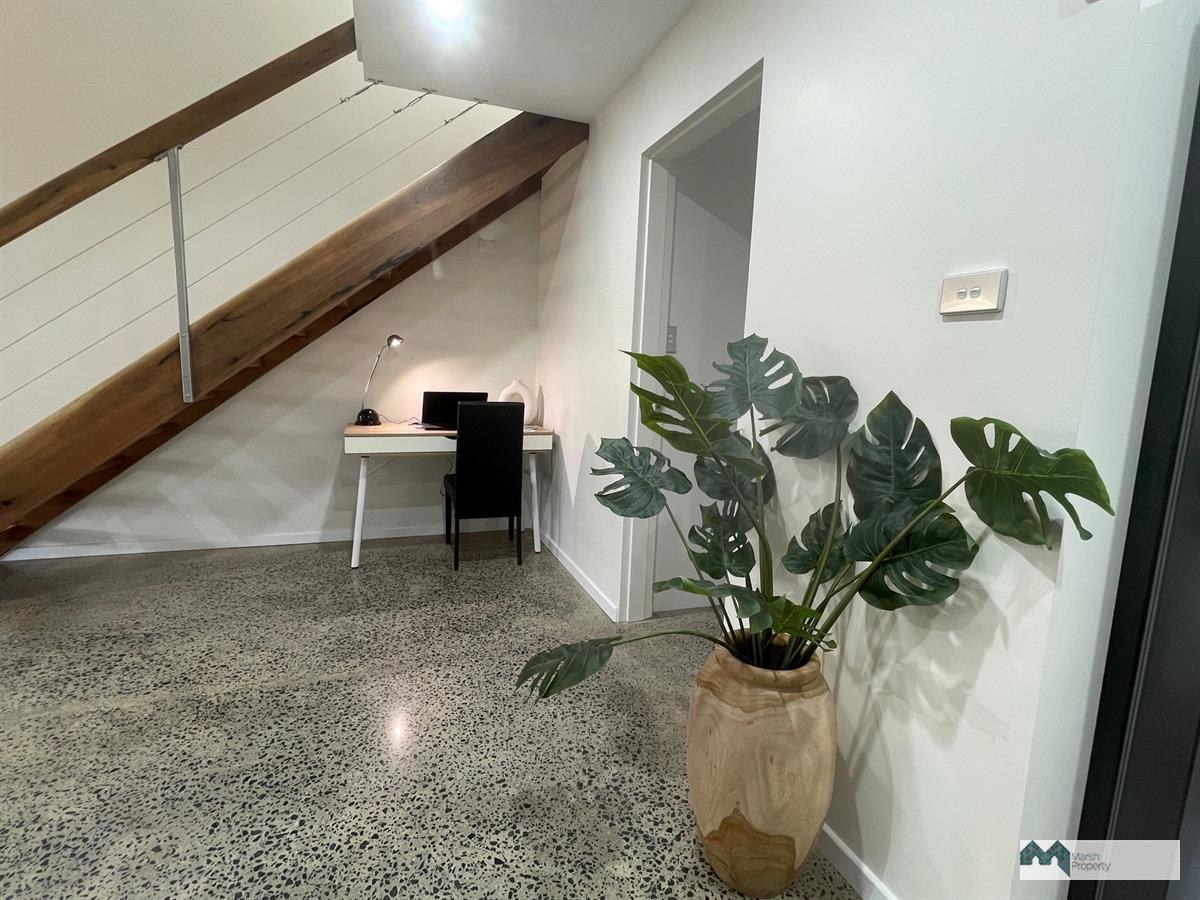 Polished concrete flooring throughout the downstairs living area underpins a very contemporary, yet relaxed beach vibe. The galley style kitchen is clean & sharp with double door fridge and spacious pantry. Relaxing in the fully airconditioned lounge area you’re only steps away from a 30sqm entertaining deck with engineered shade sail and if you’re wanting to take advantage of the fabulous beach, it is literally sixty steps from your deck side gate through a council easement.