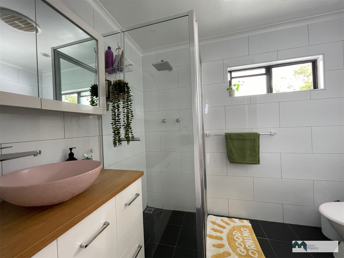 Upstairs, the main bedroom enjoys a breezy outlook through signature white louvre panels, bringing natural light and a distinctly tropical style. The chic modern bathroom exudes elegance, highlighted by a unique pink stone vanity that feels both refined and fun. Downstairs, a second bedroom—perfect as a guest room or home office—maintains the tropical flow, with louvres connecting it to the main living space.