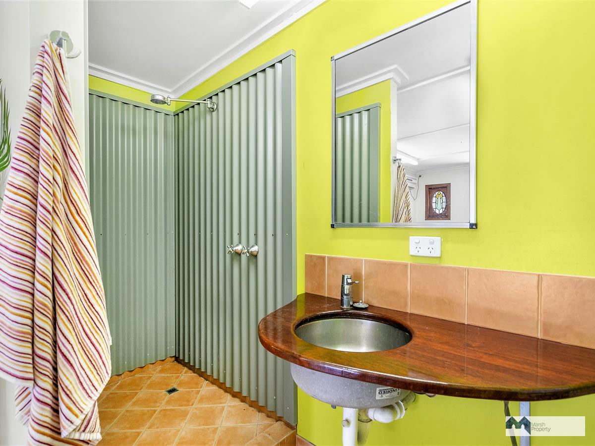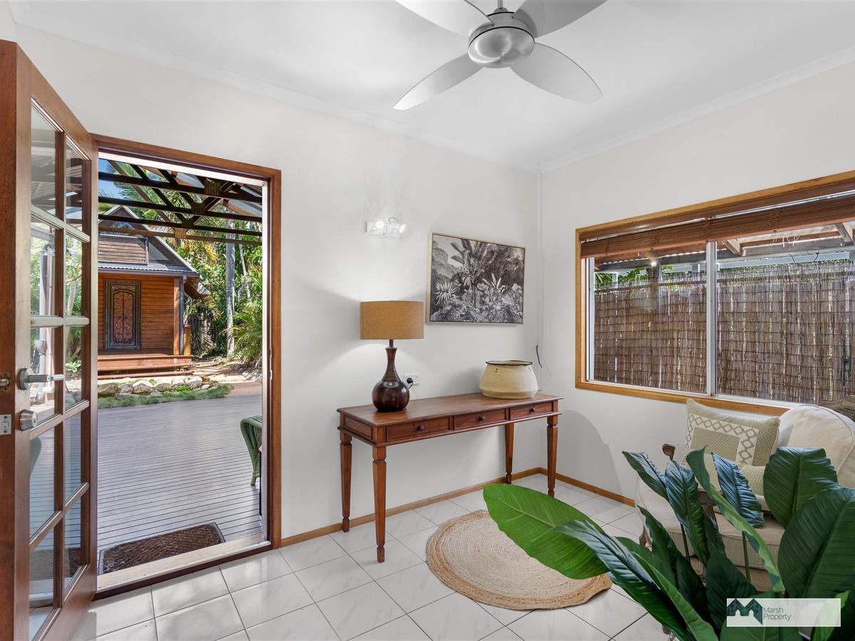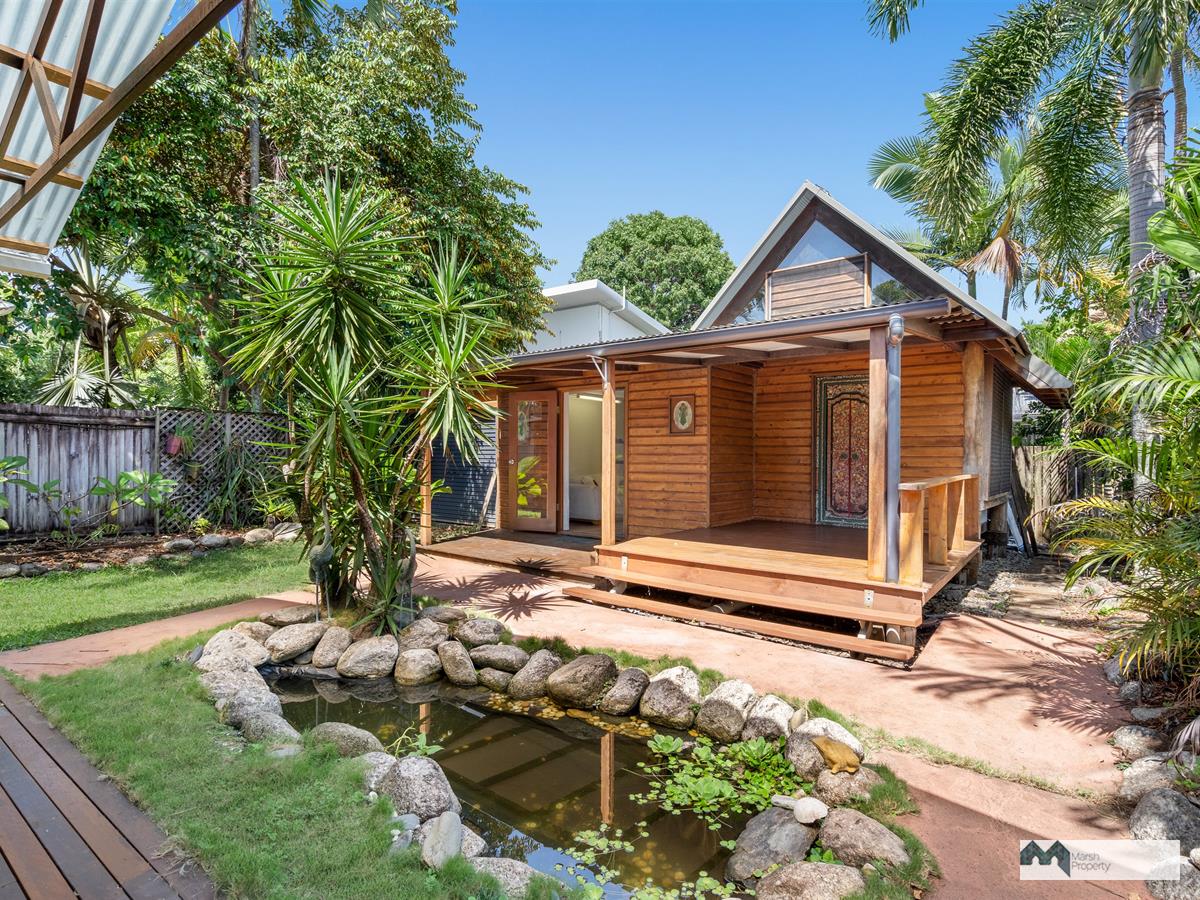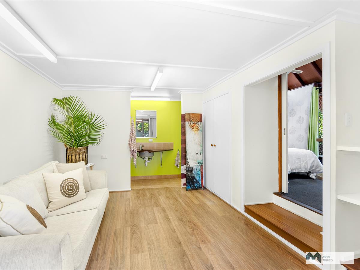 Attached to the rear of the house is a huge undercover lounging / entertaining area that overlooks the tropical back garden and the “funky” detached, semi self-contained one bedroom studio adjacent to the workshop. With a separate lounge, plus a bedroom with extra mezzanine sleeping area & a separate deck, this lends itself to a multitude of uses; airbnb, multi-generational living, work or massage studio, the options are endless.